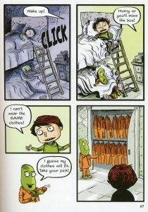 The graphic Novel I chose to read is called Earthling by Mark Fearing. It’s a science fiction novel about a boy who goes to school in outer space. This sequence on page 67 is an example of action to action closure as it walks through the process of the boy waking up. It goes from the room being dark to the light being on and someone yelling at the boy to wake up. It then shows him getting dressed for school.