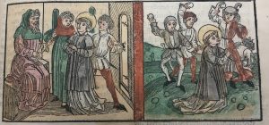 I was very interested by the Golden Legend from the 1400s and its use of line quality, as it was quite different from most modern art. The image I chose was a depiction of Saint Stephen being persecuted against by wealthy and important looking people in the first half, and in the second half being stoned to death by middle class looking men. If you don’t look closely, you are unable to see the detail on the image, especially in each of the men’s faces. The man who looks to be sitting on a throne has his hand up toward Saint Stephen. When you look into his face, it is one that could be pleading for Stephen to discontinue his worship. The lines around his eyes thin and tired, and the lines around his hand seem limp. Stephen, however, looks confident in himself, and keeps his arms crossed across his body. His eyes look defiant, and are used with a thicker line. Without a closer look into this image, many details are overlooked.
