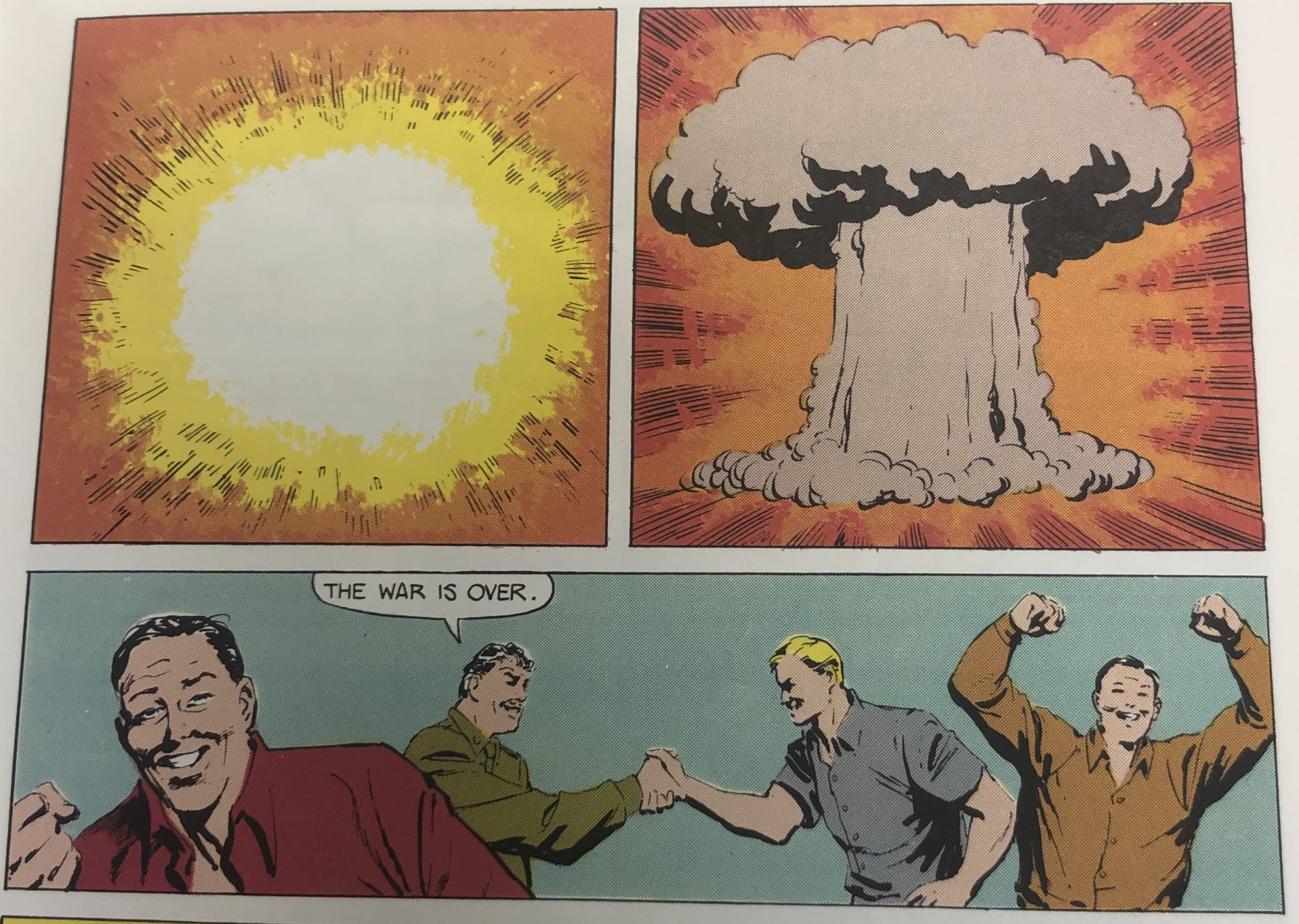 I found a really good example of interdependent images in the Atom Bomb by Brian Moriarty. There is a set of three images that would not make sense unless the words were placed in the third square. In the first square, there is what looks to be a giant ball of light, maybe a blast of fire. In the second square, you can see what looks to be an atomic explosion, as it has that familiar mushroom-like shape to it. In the third square, there are four men all looking very excited and triumphant, two of them shaking hands. All alone, these wouldn’t make much sense together. But above the men inside the third square, there is a speech bubble that says “the war is over”. I wasn’t able to read much of the book, but I know that US forces dropped the first atomic bomb on Hiroshima, Japan on August 6th (coincidentally my birthday), ending WWII. I am pretty sure that is what these images portray, and it is done through an additive approach.