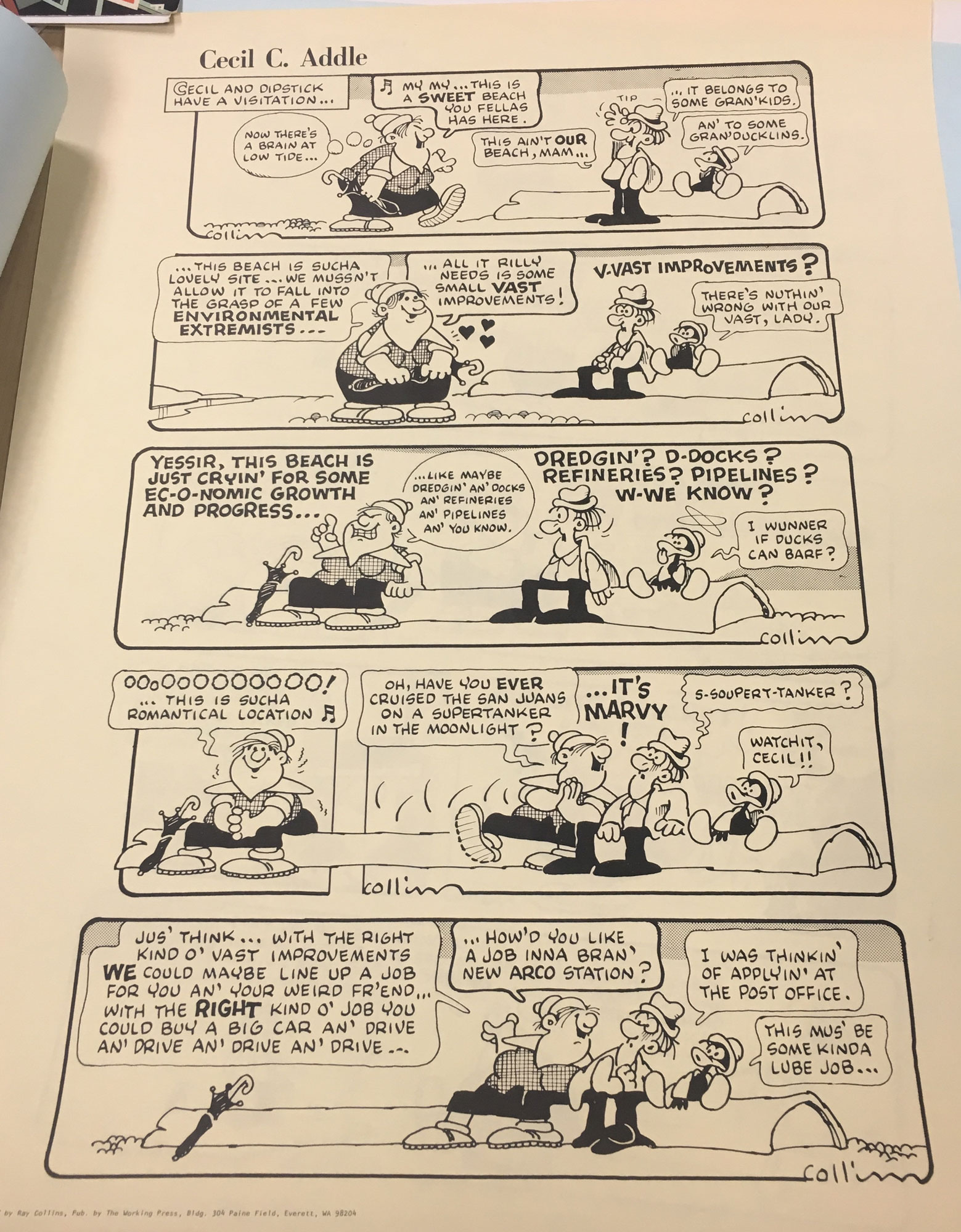 In chapter 5 of Scott Mcloud’s book titled, “Living in Line” he discusses the significance line styles play in the visual of a comic. While visiting the MASC, I really enjoyed analyzing all of the ways Ray Collins utilized lines in his comic series named Cecil C. Addle.