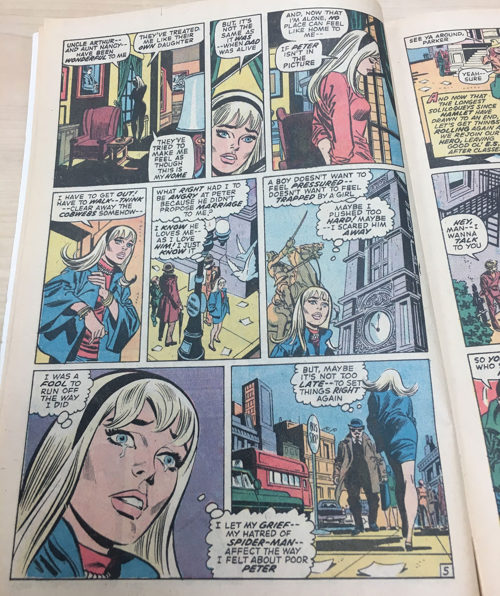 In chapter 6 of Scott Mcloud’s book titled, “Show and Tell” he went over the amazing ways image and text can complement another. While looking through The Amazing Spiderman comic by Stan Lee, I really loved the way this page conveyed the emotions this female character was feeling, however, the world bubbles provided an additional set of context that allowed a reader to see exactly what she was feeling and why.