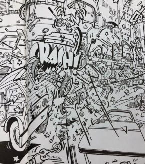 Chapter 6: “Show and Tell” from Understanding Comics, defines a lot of terms of the relation between words and images. The term that I would like to focus on is duo-specific. Duo-specific means both the words and pictures send essentially the same message. I found many examples of this in the MASC, but one example particularly stood out to me. In the graphic novel Raw, by Art Spiegelman and Francoise Mouly, there is an illustration of a car crashing along with the words “CRASH” emphasized. This is a clear example of duo-specific because if the words crashed weren’t on the page, the reader would still clearly know what was happening in the scene. The words “crash” and the image of the car crashing are sending the same message to the reader that the car is in a collision.