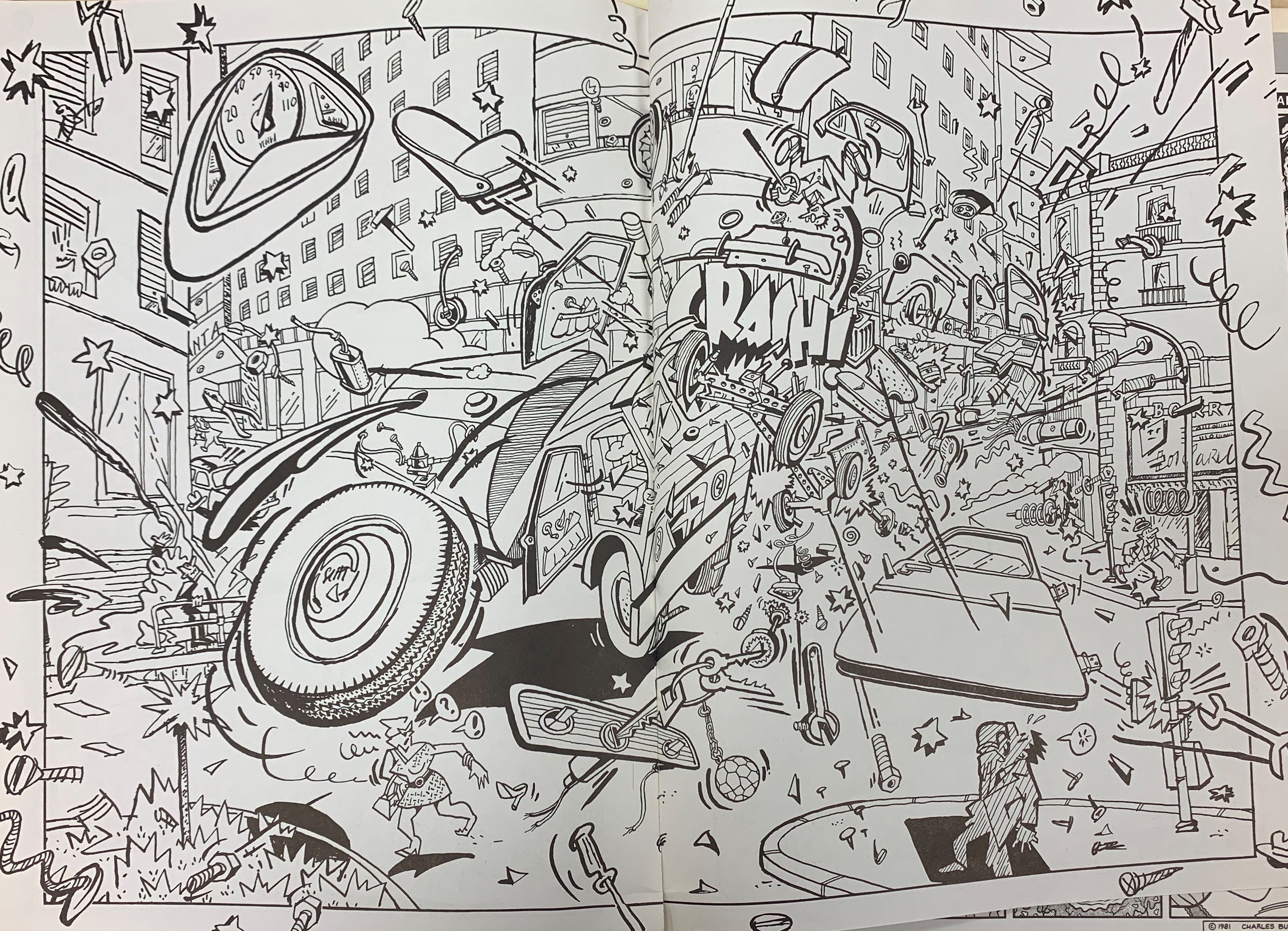 When I visited the Manuscripts, Archives, and Special Collections (MASC) on Tuesday in class, I found examples for both the use of line, and the use of interdependent words and images in a comic. For my example of line, I examined this full-page spread found in the comic, Crash. This page depicts a car crash, and as you can imagine, a car crash would be very chaotic, giving people stress and anxiety. The artist of this comic created an image portraying the crash, just as it would make you feel. You can see the car parts and action lines flying in every way possible. These lines laying across the page with no specific order or sequence provokes anxiety to the average viewer because there is too much going on and it is stressful to look at. This anxiety is also caused by the way each line and shape in this crash scene is darkly outlined, but unique in its own way, not contributing to any order or sequence. In addition, the way in which the artist draws car parts and action lines outside of the borders of the panel goes to prove that the chaotic mess of this crash can’t be contained by the border.