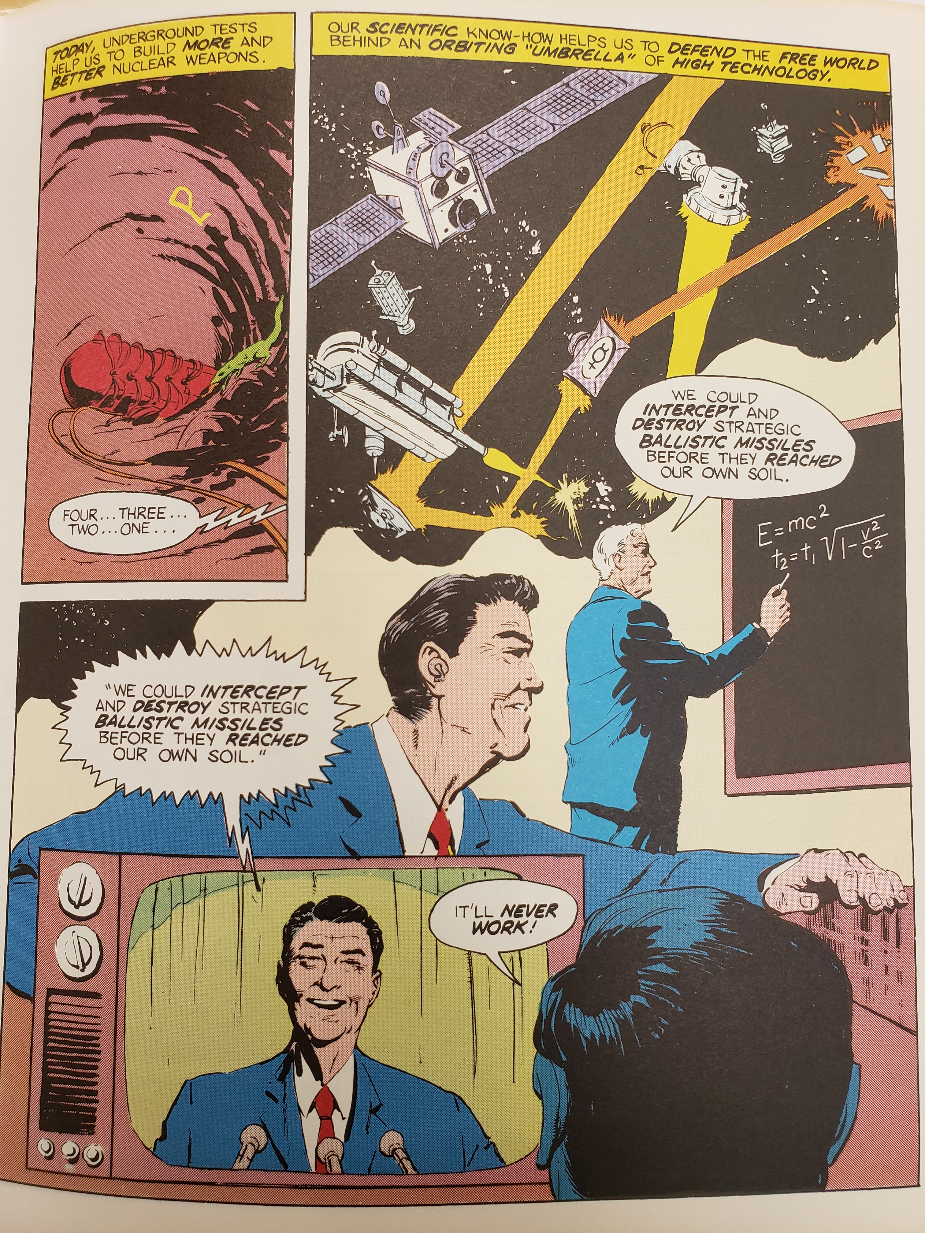remember the comics name. On this page the words go hand in hand with the imagery, I believe it qualifies as an Interdependent word/picture combination. More than that certain words are bold in the text to amplify their effect, but the full idea cant be conveyed without any of the text or just the text. Especially when it comes to the character dialogue in the speech bubbles, without the imagery it would not make any sense for what kind of message was trying to be portrayed to the reader on this page. You wouldn’t be aware that the repeat of the message from the scientist was coming from the president over the television to a viewer proclaiming his disbelief. More than that, even with the description in yellow up above the reader wouldn’t understand what it meant by an “‘Umbrella’ of New Technology” without the visual.