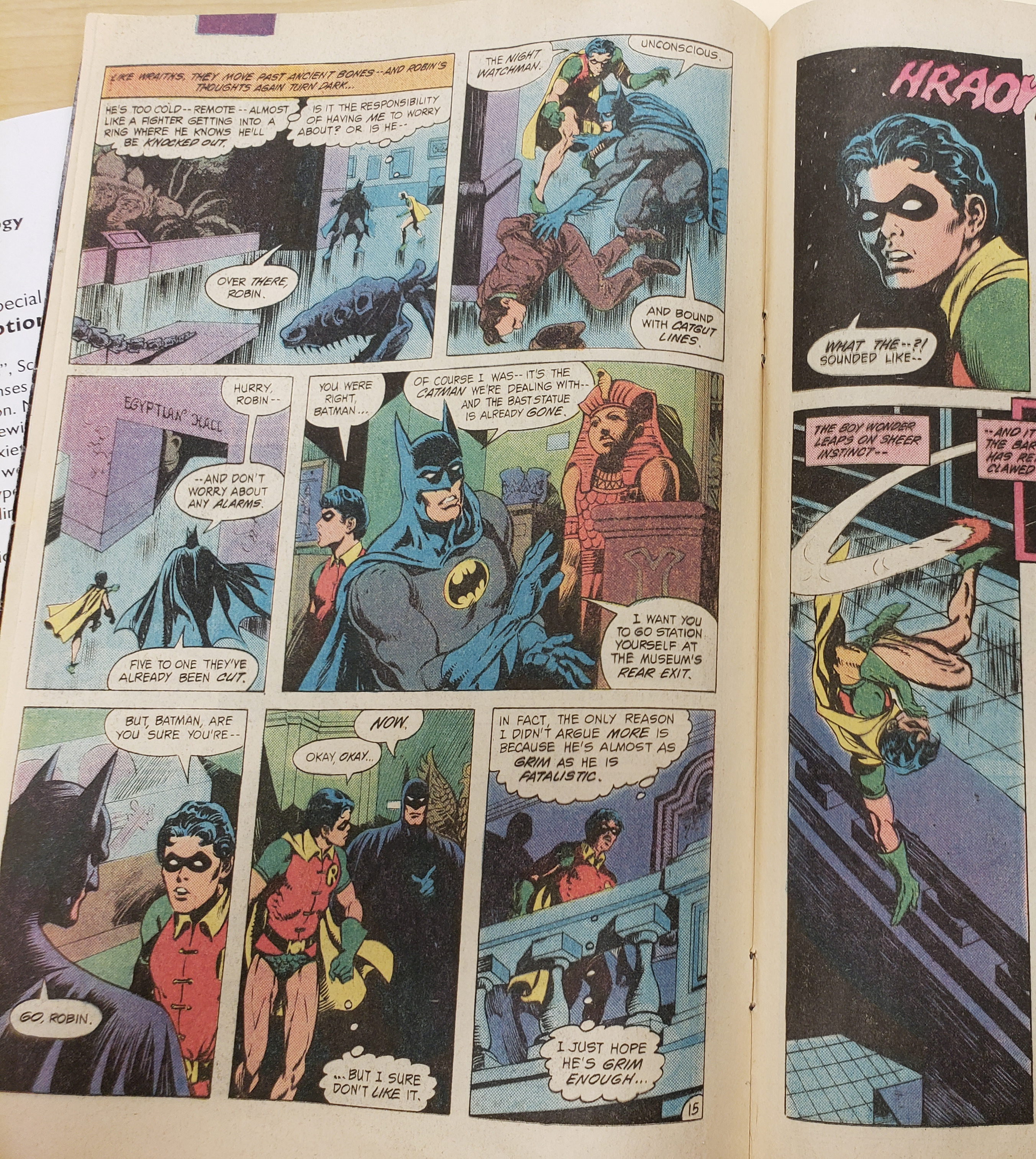 perception of senses and emotion. I finally settled on a scene from the Batman vs Catman book. The scene takes place in a museum at night where Batman and Robin are investigating and about to encounter the villain. The lines used in this scene are portraying a creepy and dark ambiance through their jagged repetitive, almost chaotic nature. This is commonly shown in how the lines are being used for the characters shadows and lighting around the scenes. Batman is often cloaked in these scenes by these lines, perhaps demonstrating his seriousness, especially in the bottom two left panels. These dark jagged lines are used everywhere on this page for the shadows and lighting and on characters to show the darkness/seriousness the author wants to portray. For an example of words and pictures together I decided on this image from a comic that described the nuclear bomb and technological innovations that followed during the cold war. Unfortunately, I don’t