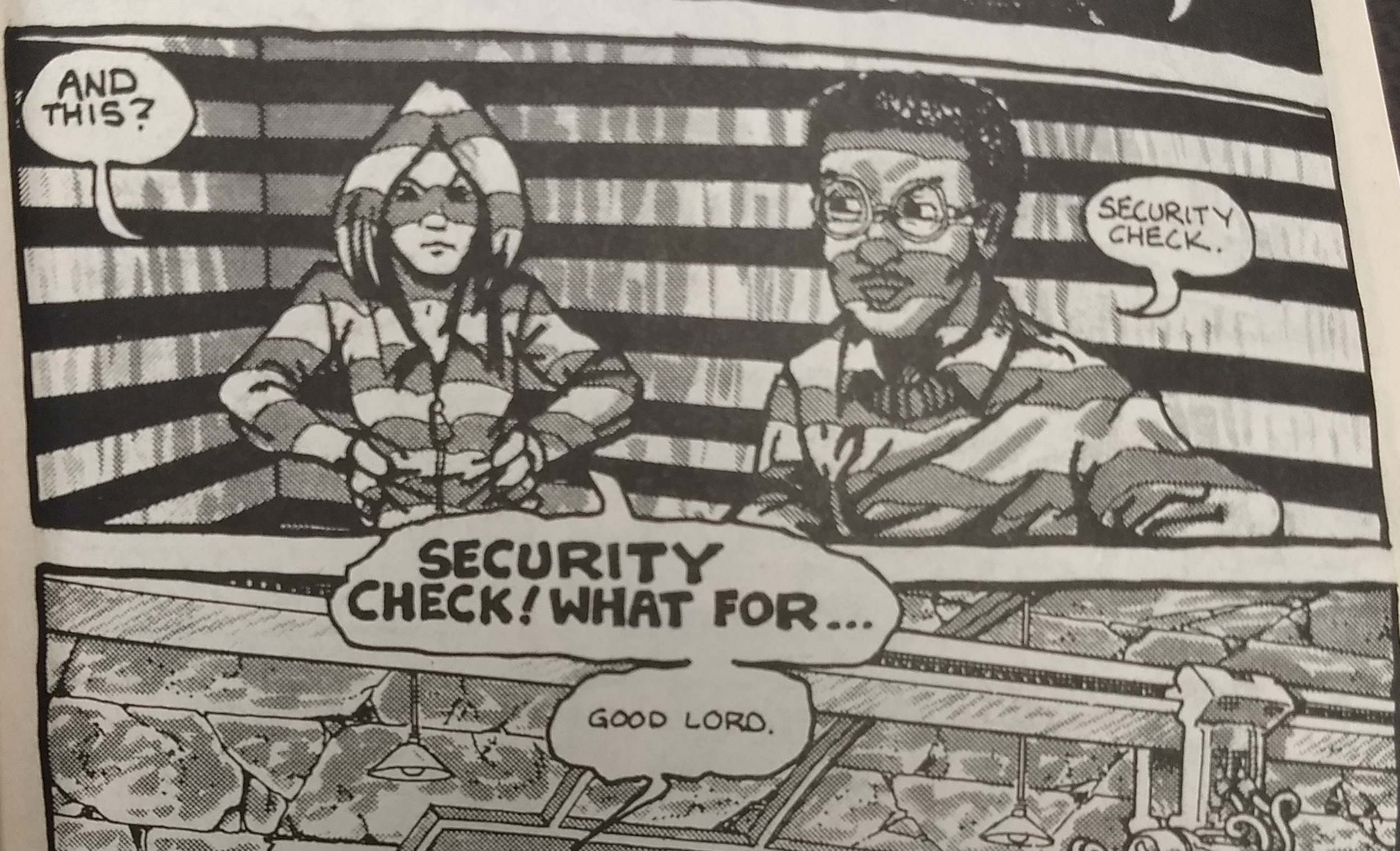 This makes sense, because from what I have gathered, the two characters are the bad guys. The shadows from the lines also cover parts of the characters faces. This makes them more mysterious and dark, and the reader doesn’t trust the characters.