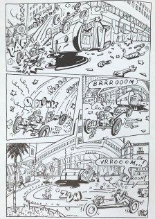 A page from the cartoon short “Crash” depicting a rambunctious mess of collisions and cars zooming by. (Crash, Charles Burns, 1981, pg 88)
