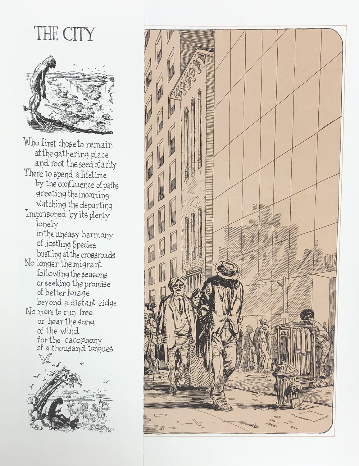 A page from “City” with a passage about the drudgery of urban life along with a illustration of a city street. (City: A Narrative Portfolio, Will Eisner, 1980)