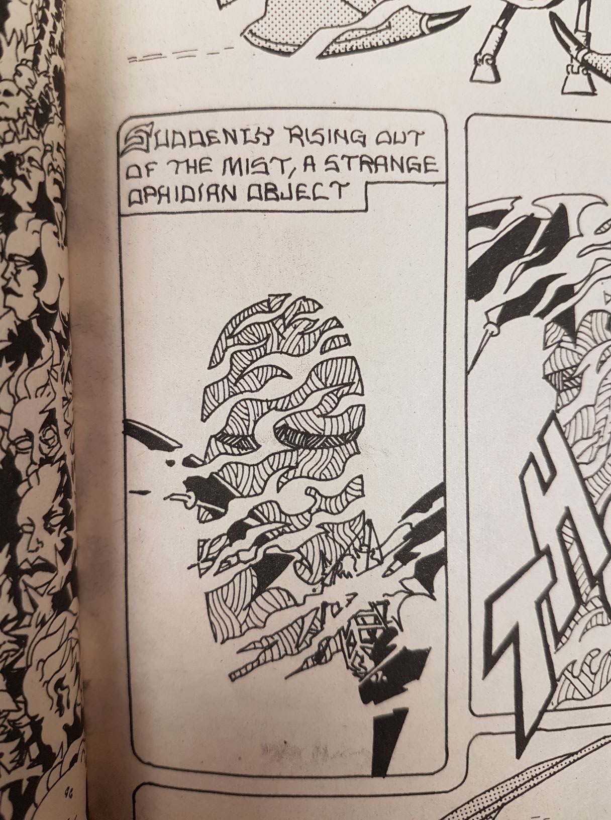 skinny strange alien with no eyes that is talking to a bunch of military admirals about war that is going to end the world that the military is involved with. He gets enraged when they refuse to stop building nuclear weapons. This rage is shown very spastic with the line art that is in the comic. The one panel where he says “STOP!” multiple times and it is his character stacked up multiple times shows how erratic and jumpy he is with the rage and angry he is bursting with. The next panel shows him in comparison to the character that is more calm with him kind of buzzing with rage with all of the lines looking like needles coming out of him. This shows how enraged he is still after the initial burst on the previous panel and how somebody more calm doesn’t have that crazy lines coming out of him.