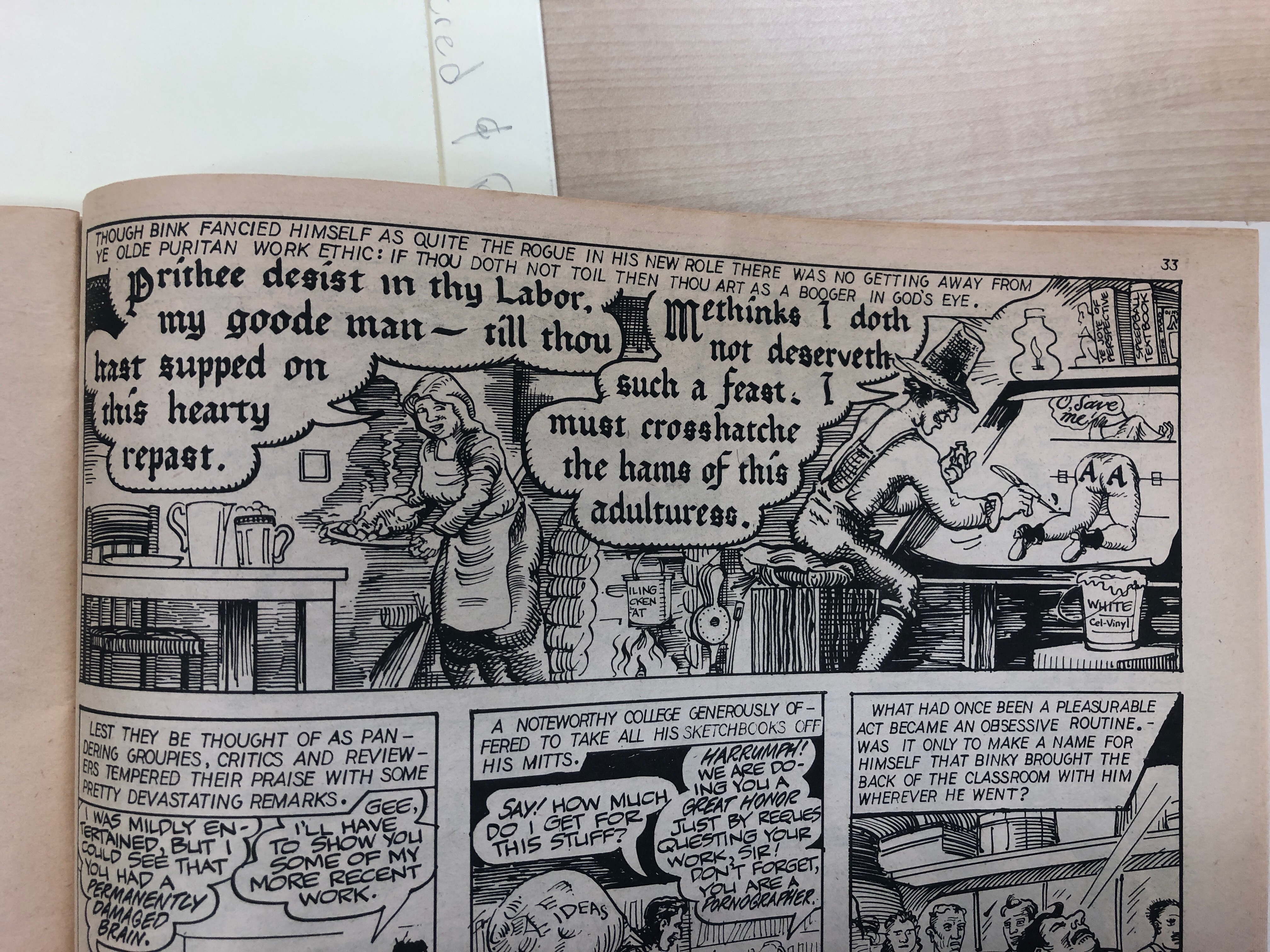 . Even though I do not fully understand the of the comics as they use some strange, old English. The lines that are used to create shadow caught my attention as it create the setting when the Kerosene lamp is the only light source. This give me a feeling that this guy has been working really hard, so hard that when the night come he use the lamp to keep working. This use of line to create the dark environments and character make me acknowledge the passion of the male character about what he is doing. In addition, not only the props and character but also the text bubbles were given some light to show that they are appear in the dark too which is interesting. By simply using multiple lines in object, the author successfully describe the emotion they want the reader to feeling when reading this page.