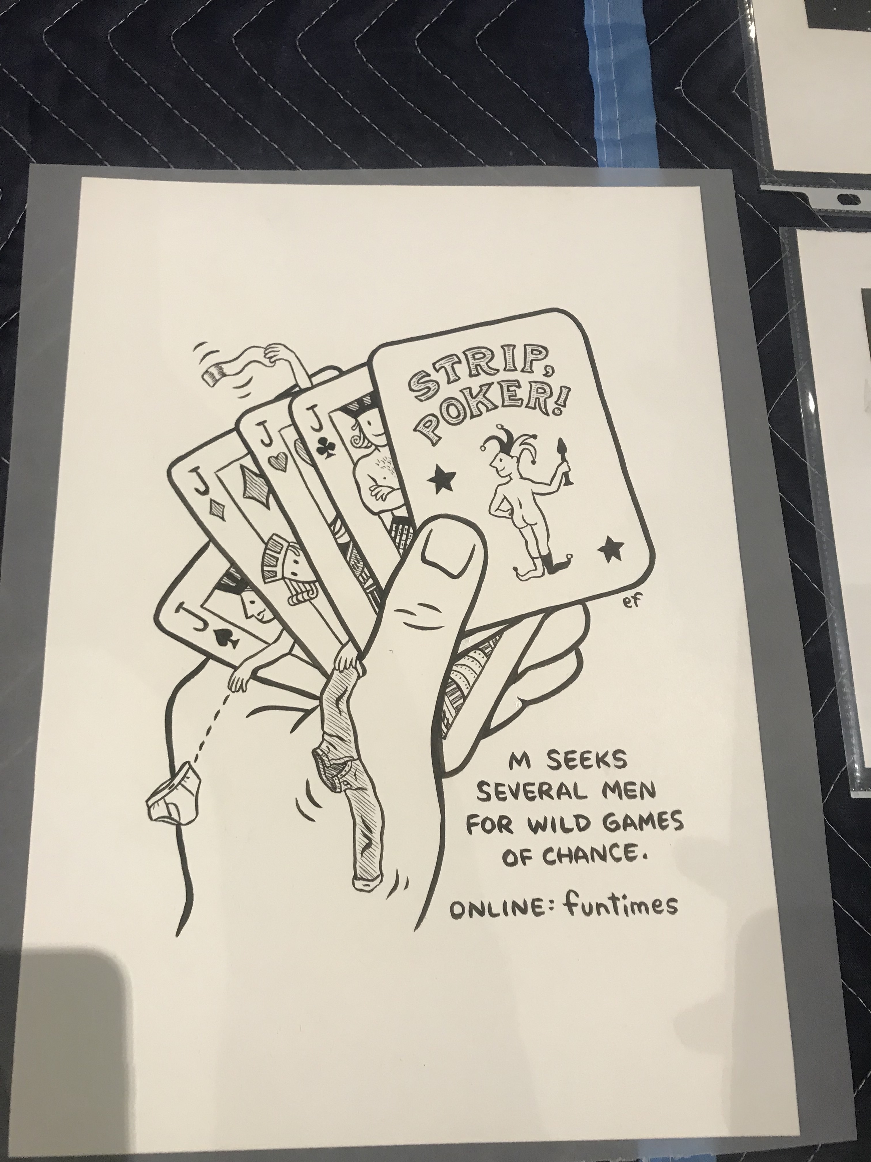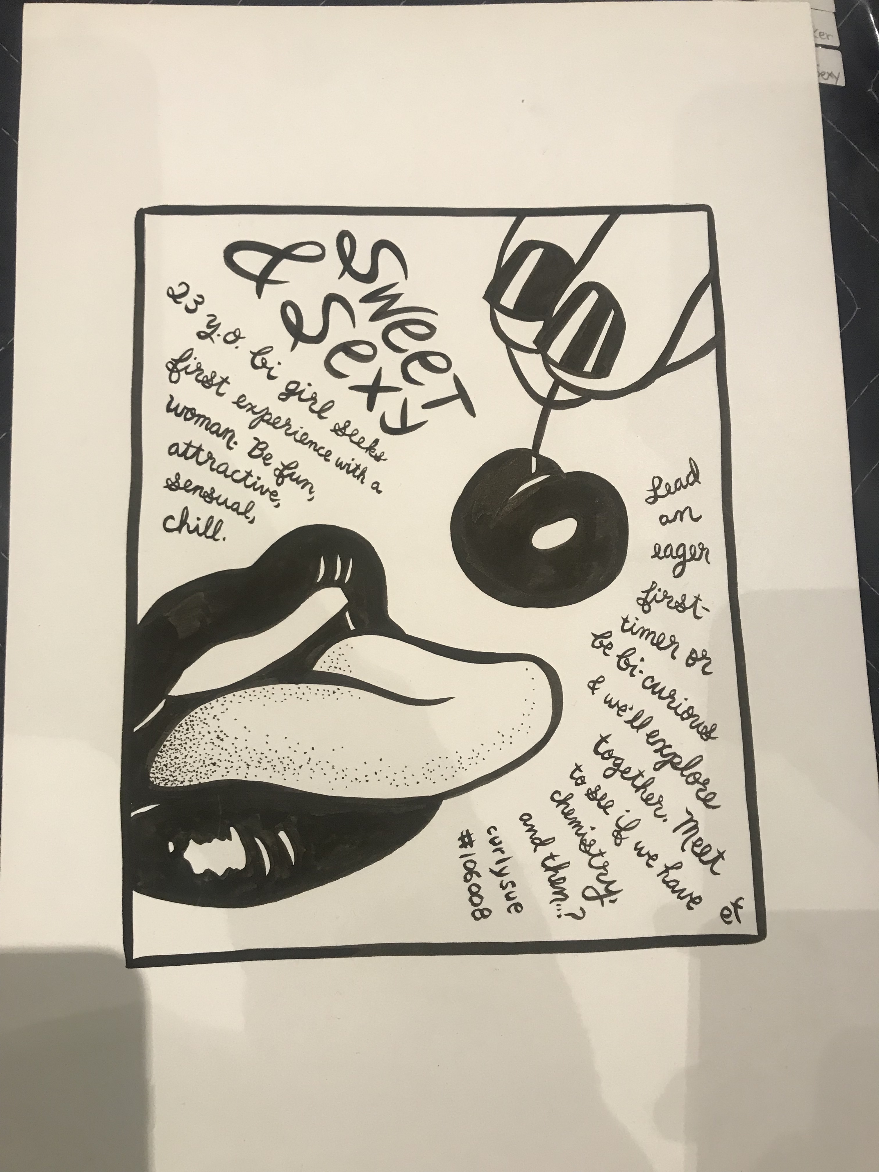 artwork. The first piece titled Strip Poker and the second piece Sweet and Sexy seem to tie together in the idea that it seems like an “advertisement” to find men and the other to find woman. It seems like the author is struggling with her sexuality or is struggling mentally on her emotions. Ellen Forney’s voice within these pieces I think speaks very loudly, and that’s what really made it stand out to me. When first looking at these pieces you can see that those works of art speak for themselves in a way. You can tell that there is a deeper meaning to the works than just when you first look at them. After reading through Ellen Forney’s background, it explains that she is struggling with bipolar disorder and that a lot of her artwork shows the journey, struggle, and acceptance she has gone through after being diagnosed with this disorder. This is prevalent in even just these two pieces of work being that she seems confused on exactly what she wants and is making that clear to her audience.