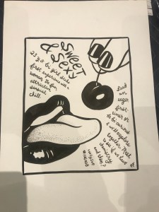 During the trip to the fine arts display, I feel like a lot of the pieces of art resonated with me. I think the idea of the pieces being “alternative” and having the descriptions of the artists, really helped me look at the comics in a different light than I would have originally. I think when the pieces are made to be more alternative the artists create a deeper meaning with the pieces they are creating and seem to be a little more personal than a mainstream artists would create.