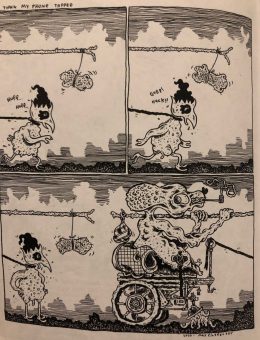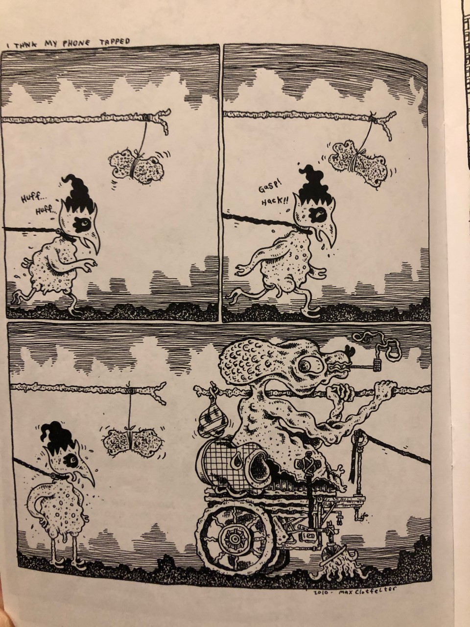 This illustration by Max Clotfelter was displayed in the WSU Art Museum Collection Study Center from the Northwest Alternative Comics exhibition. In this image, Clotfelter made me feel sympathy yet relatability to the character in the comic. I interpreted the graphic to be a representation of the bird like figure trying to reach something that appeared to close within reach yet impossible to grasp. The bird is being held back by a leash that is making it impossible to reach the object it is striving for. The first two images show movement of the bird walking forward, so I interpreted that as the figure moving forward towards the food, but the food kept moving as well. The last image is when the bird realizes the resembles between the creature being pulled by a leash and the leash that is holding the bird. The voice that spoke to me about this comic is that the bird had a goal that seemed impossible, but that the lesson learned is that sometimes you can do everything right, but somethings just weren’t meant to happen.