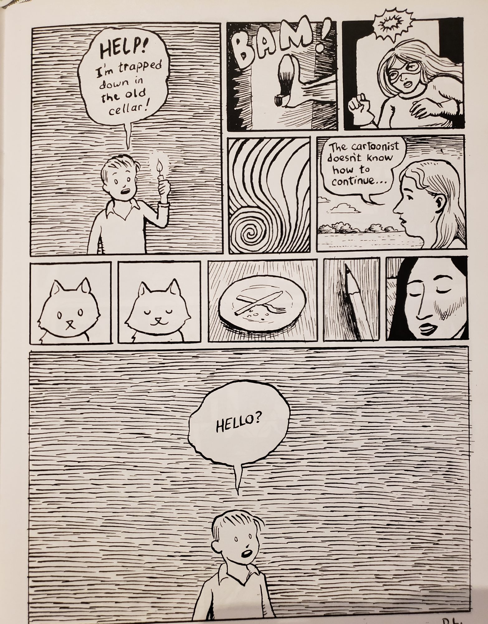 I found this example from David Lasky interesting as all although for different reasons. The artist created this meta-type comic about how cartoonist isn’t sure how to finish the comic. I related to this concept heavily as an artist and writer in my free time I often end up with half-finished works with no idea how to proceed. A form of communication was created between me, as the reader, and the artist through this shared experience that the artist depicted. Another thing I find interested is how the artist used several small lines to represent the dark instead of just black or a dark gray. Without the candle the boy is holding in the first panel I wouldn’t have realized he was in the dark. However, with the candle and all of the small lines closely compacted together, the mind uses closure to see one shade of gray and understand that it is dark. Another minor thing I liked and was surprised by was the actual texture on the page. While the feeling of the ink isn’t as noticeable in other places the close placement of all the lines makes it easier to feel the slightly raised areas where ink was laid down on the page. It creates an interesting, almost imperceptible texture as the reader runs their finger down the page.