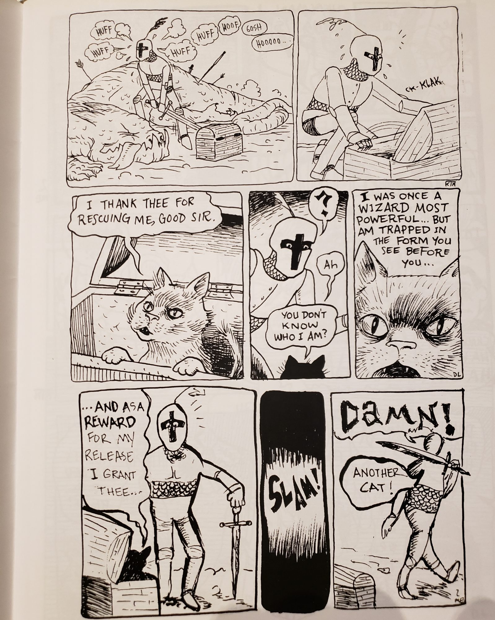There were several comics that I enjoyed at the Art Museum Collection Study Center but my favorites were from “Manifesto Items 5” by David Lasky. The zine was a collection of several comics made by David Lasky. What caught my eye first was the use of cats in several of his comics. If I were to pick a pet I would prefer a cat and I just like cats in general. The use of frequent use of cats by David Lasky gave me the impression that he was trying to communicate that he likes cats as well. My first example from David Lasky also includes a knight looking for treasure and the cat mentions that he is a wizard. This appealed to me because I enjoy the fantasy genre. The artist also expressed a sense of humor that I feel like I connect with and enjoy. It is already humorous for there to be a talking cat inside a treasure chest but the artist really portrays the humor when the knight marches away angrily, annoyed that he once again only found a cat. Even though it isn’t illustrated as a frame I immediately picture the knight looking in several other chests and only finding cats. That one line “Another cat!” effectively lengthens the timeline of the story without the lengthened part even being drawn.