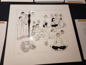 Visiting the art museum and getting the chance to view the exhibit was certainly interesting as it was comprised of, not only comics that were similar to those in the MASC, but also getting to see certain sections of pieces that stood as accurate statements for the artist. Many of those pieces were very intriguing, especially after reading the description, but one in particular was David Lasky and his piece entitled “Cartoonist Sur L’Herbe.” What really stood out to me by simply observing the picture is that the subjects each have their comic character close to them. Lasky tries to bring out the fact that many comic artists were “expressing their own dysfunctions for the reader … [stating,] ‘you’re not alone’” (qtd in WSU’s Art Museum Collection Study Center Northwest Alternative Comics exhibition 2016). I like that fact that artists were creating characters that represented the complexity and flawed personality of humans rather than a perfect, flawless figure; everyone has their flaws. Depicting this type of concept through a comic of his own fellow artists enunciates his own belief that his work does and intends to do the same.