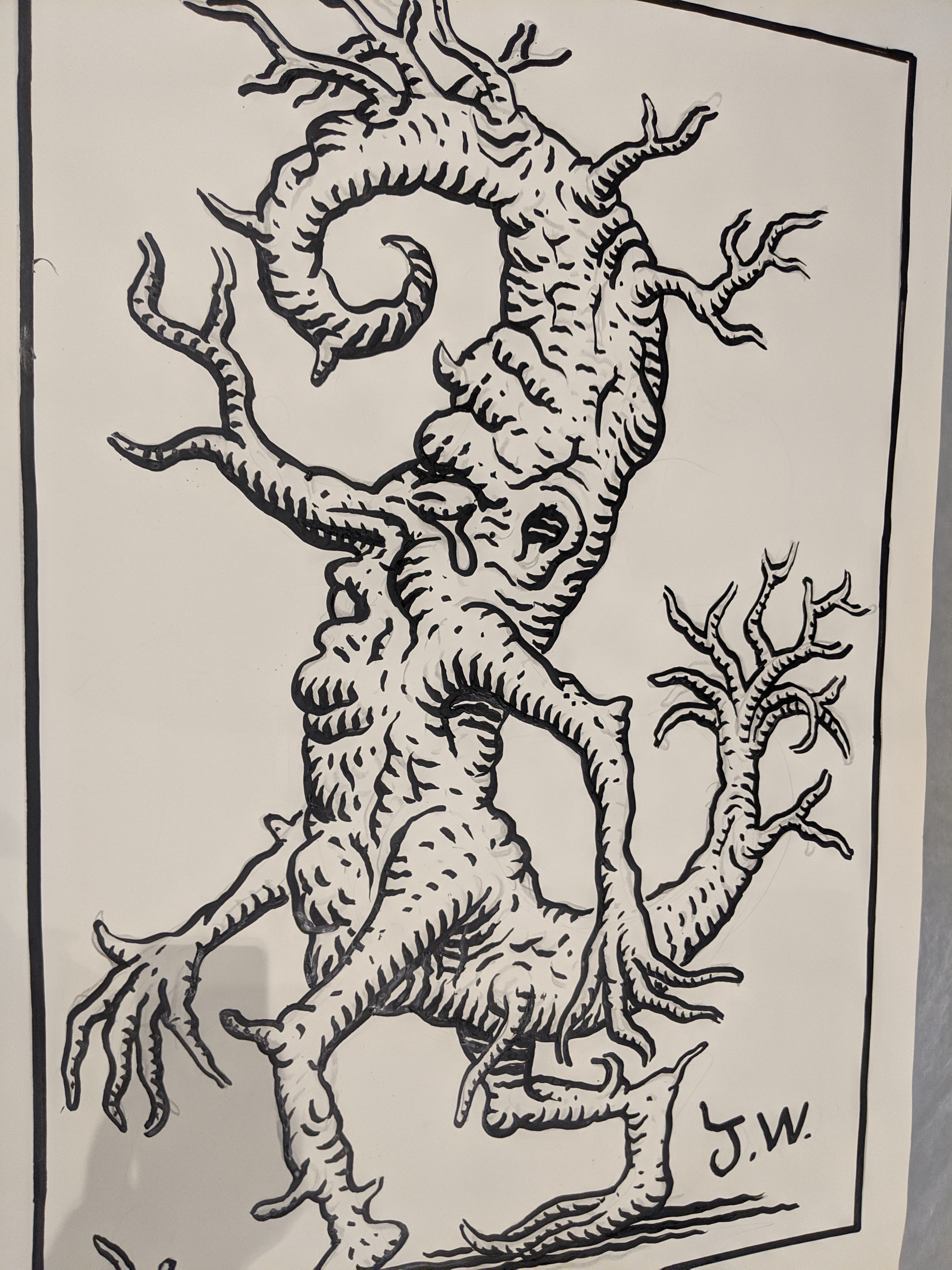During my time at the WSU Art Museum Collection Study Center, I got to see many works of art from many different artists and designers. After looking around I came across this large poster image from Jim Woording. This stuck out to me because of the simple use of line and spacing on the work. From what I can see, it looks like the tree is walking and just minding its own business. That is a great use of time shows that the image has a sense of motion to it. It’s an action shot. I feel like it was a good idea not to use words in this because it would take away from what Jim Woording is trying to show the viewer. And I believe he is trying to show the viewer a sense of life and complexity in natural life. His use of lines gives the tree a face and some facial expressions that a normal tree would not normally have. The tree looks like it is crying to me. Overall I really did enjoy my time at the WSU Art Museum Collection and I am glad that I got to see this work of art.