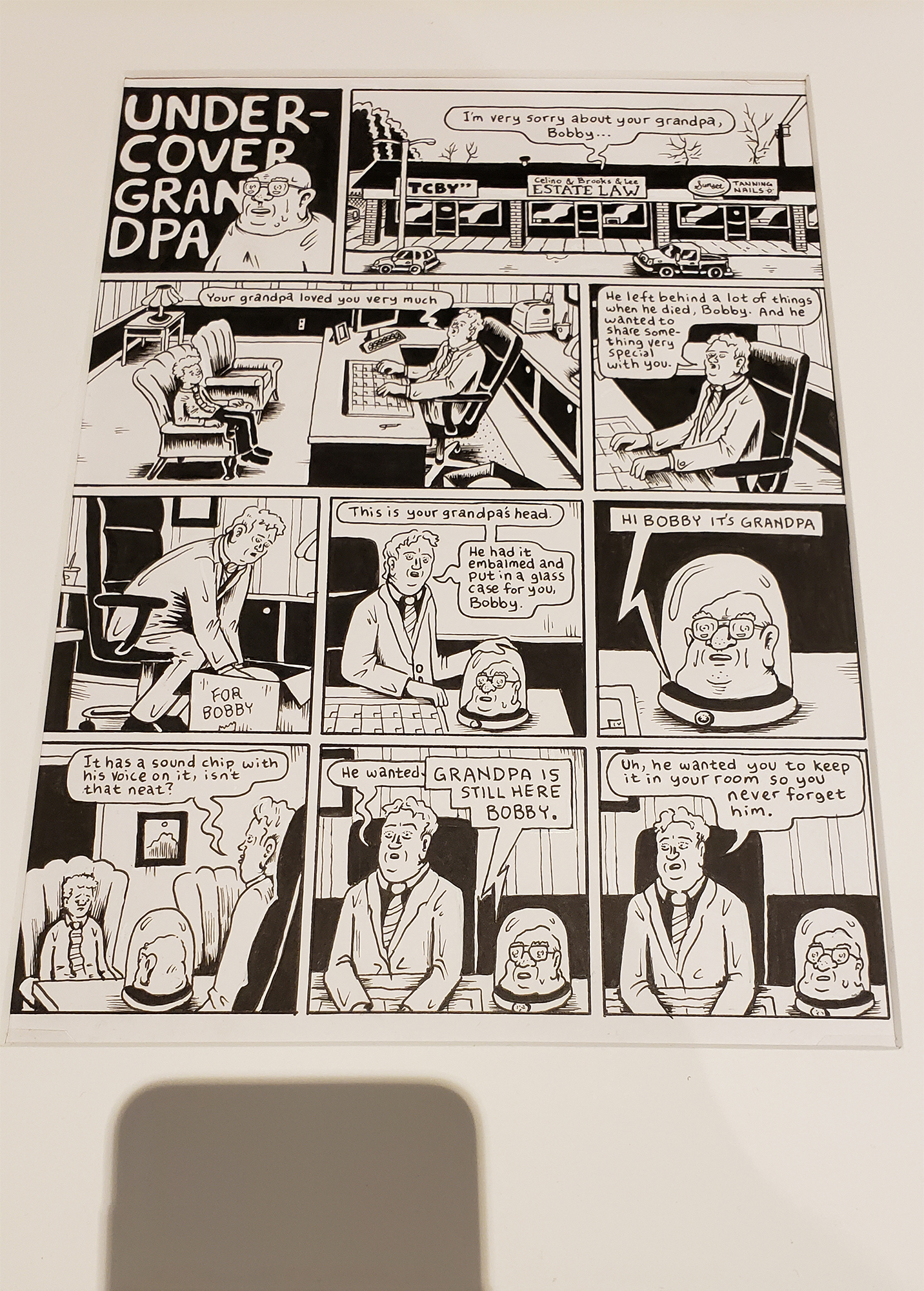 I chose a comic from the Fine Arts Center Collection called “Undercover Grandpa” to look at how it shows the authors individuality. There were many comics at the Collection that were appealing and showed the differences from artist to artist, but this one caught part of my sense of humor and what I find interesting. This comic is a two page comic, but I’m only showing the first page. This first page is really just a one sided conversation from a man in a suit working for an Estate Law Firm. The man is apologizing to a young man named Bobby whose Grandpa has just died. The estate agent is serious and mournful for Bobby during his conversation telling him his Grandpa loved Bobby “very much” and gives Bobby something “very special” that his Grandpa wanted him to have. This very special something is his Grandpa’s actual head embalmed and put in a glass case. The head even speaks from a voice chip to Bobby. While the agent is speaking the Grandpa’s head says “Grandpa is still here Bobby” rather creepily interrupting the agent before the agent continues telling Bobby that his Grandpa wanted the head put in Bobby’s room so he never forgets him. This entire one sided conversation where Bobby never speaks and looks extremely unhappy the entire time is completely ludicrous and rather dark humor. His Grandfather has just died and gave him his real head with prerecorded rather creepy voice lines with the request of keeping the head in his room. This conversation is played out seriously by the estate agent adding to the uncomfortable rather dark humor wrapped around the situation. Expressions of characters are clearly unease and sorrow in Bobby with the estate agent playing everything straight. Grandpas head doesn’t change expression either, adding to the awkwardness of the moment. The humor is dark and uneasy which of all things I think really speaks to what type of person wrote it. I feel that humor is something that isn’t easily faked and comes through more true in work and is easier to notice than some other emotions, which is why I chose this comic.