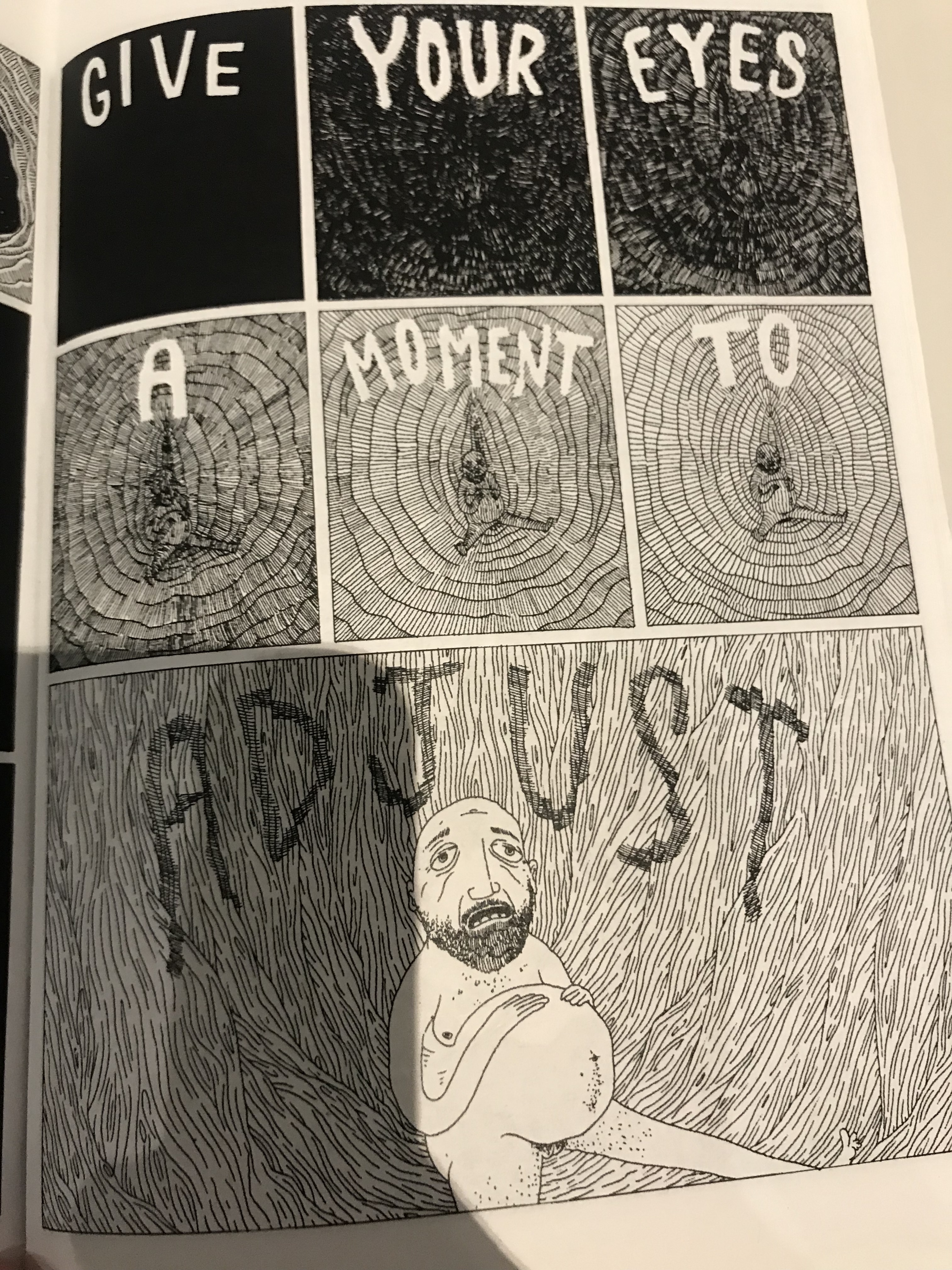 During my visit to the WSU Art Museum, I looked at a lot of great artwork and graphic novels. A work that stood out to me was a graphic novel titled “Abruption” from the Northwest Alternative Comics Exhibition. The story is very open ended and can be interpreted in many different ways. She chooses to make it this way by using very little text which leaves it open for interpretation. The story starts with a sequence of dark frames with the last three containing a white ball that appears to be growing. It then shows the what seems to be the protagonist in the form of a man in a weird setting that seems to be a different planet. In the first few pages he is running from little creatures in the forest. He is running from something and trying to find something, but it’s not obvious what he’s running for. He then climbs a weird tree like object and goes into a hole at the top. Voices and hands reach out and call to him which frightens him, so he leaves. He continues to run and run for a long time and eventually finds another man that is dark colored.