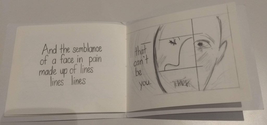 This zine also uses picture and word combinations to tell the story. The short declarative sentences are very melancholy and straight to the point. It’s almost as though the artist creating it is in between tears, which makes it more emotional.