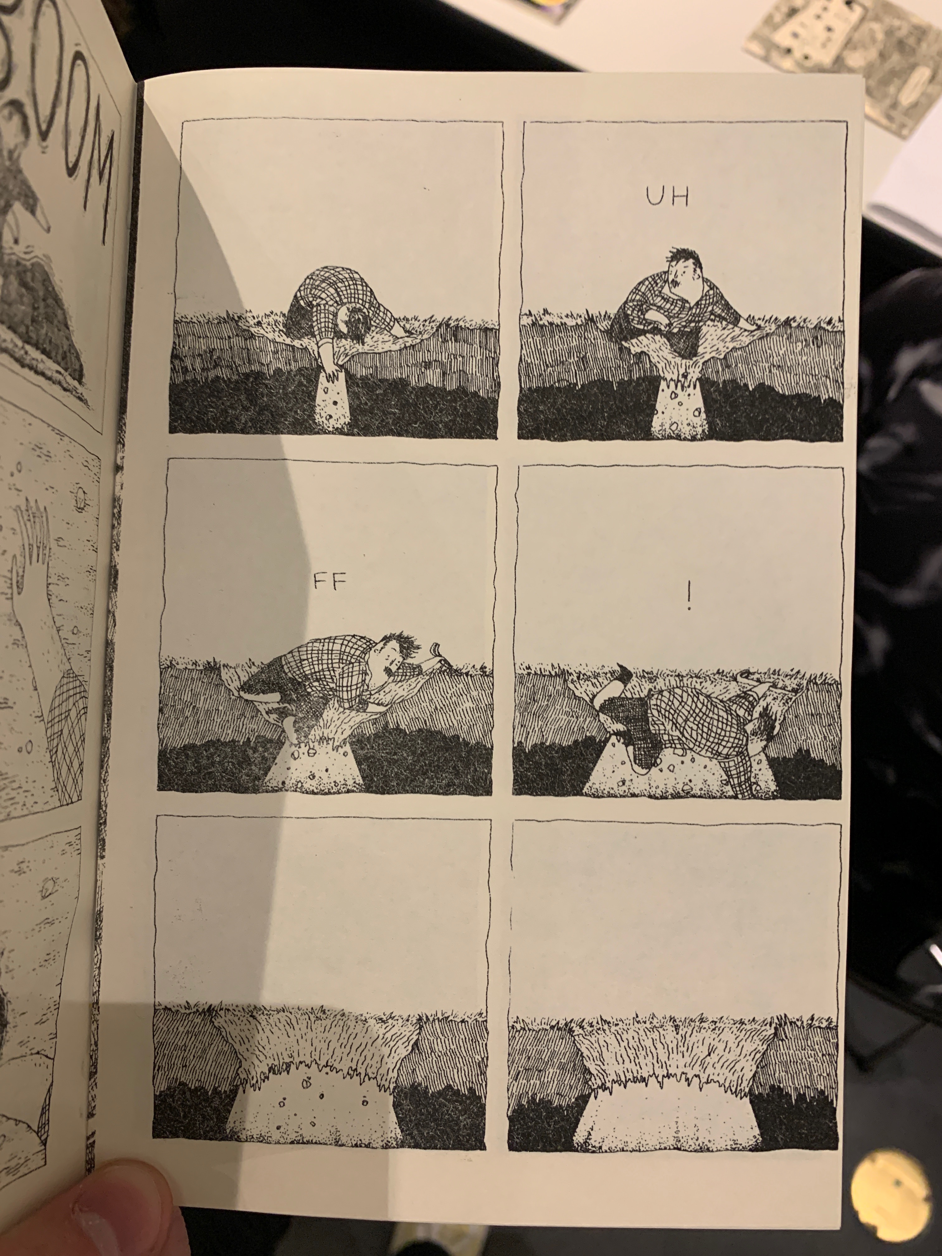 For this activity, I wanted to find the image/s that spoke the most to me or gave me a reaction. One of the first books I picked up ended up giving me an emotional experience and was very eerie and creepy to me. Apocalypse Dad, was filled with cool images and depictions of a father attempting to find his ‘daughter,’ however, weird twists came about in the end. I chose these specific images because this is where the story took a turn and began to reveal the darkness beneath everything. The darkness, s well as the space the images were created in, gave me a sullen and tense feeling, which made me want to continue reading. This helped me to be drawn into this zine and showed its true purpose in the end. Ultimately, I had fun exploring these pieces of art, and wish to continue doing so in the future.