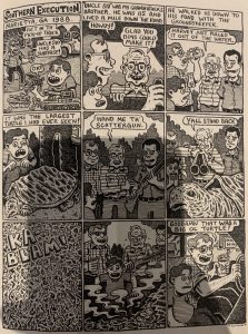I chose this comic because I thought it was funny and I related to the humor. My uncles are hunters and it reminded me of when I would visit them and watch them prepare their kills, something I was not use to as a kid. I also liked the art on this comic and the style of the characters. The word and image combinations are very funny to me: the look on the kids face at the end while the dad praises the size of the turtle especially. Likewise, how the time jumps in the last scene to the father and son in the car after the turtle meets its demise is funny. The depiction of emotions and the design of the characters were my favorite part of this comic and the scene of very funny to me even though it was somewhat dark.