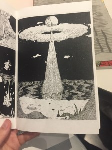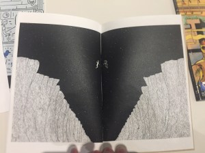 During our visit to the WSU Art Museum Collection Study Center I looked at the comic Abruption by Taylor Dow. I chose this comic because I felt that it was very unique and I really like the art style used. This comic used minimal text, so the majority of the story was told through imagery alone. When looking at other comics by the same artist I noticed that this was a common theme in his work. A couple of pages from Abruption were also enlarged but I’m choosing to look at the comic as a whole. Since this comic had minimal text, and since the imagery was a bit bizarre, it was very open for interpretation, but there was a general storyline that was easy to follow. It starts with a person in a clearing, that appears to be on a strange, maybe alien planet. He starts to run from some weird human like creatures and ends up climbing up a giant tree in the ocean. In a hole in the tree there is another person who calls out to him, but he keeps running and climbs further up the tree while hands reach out at him. He then jumps off of the tree onto what appear to be clouds and finds a house that’s very dark inside. There he encounters another “person” who eats a ball of light and leads him up a ladder to what looks like a moon.