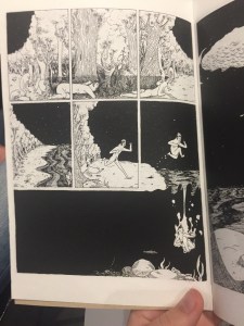 One of my favorite examples of this is when he shows the main character jumping into the water, where he has two different frames that line up to show a larger scene. Another part of the story where I feel that the artist utilizes time frames is towards the end, when each page is a full spread showing the canyon, and multiple pages in a row show the same thing to sort of extend the amount of time that’s passing. This comic was definitely very interesting, and I liked how open to interpretation it was.