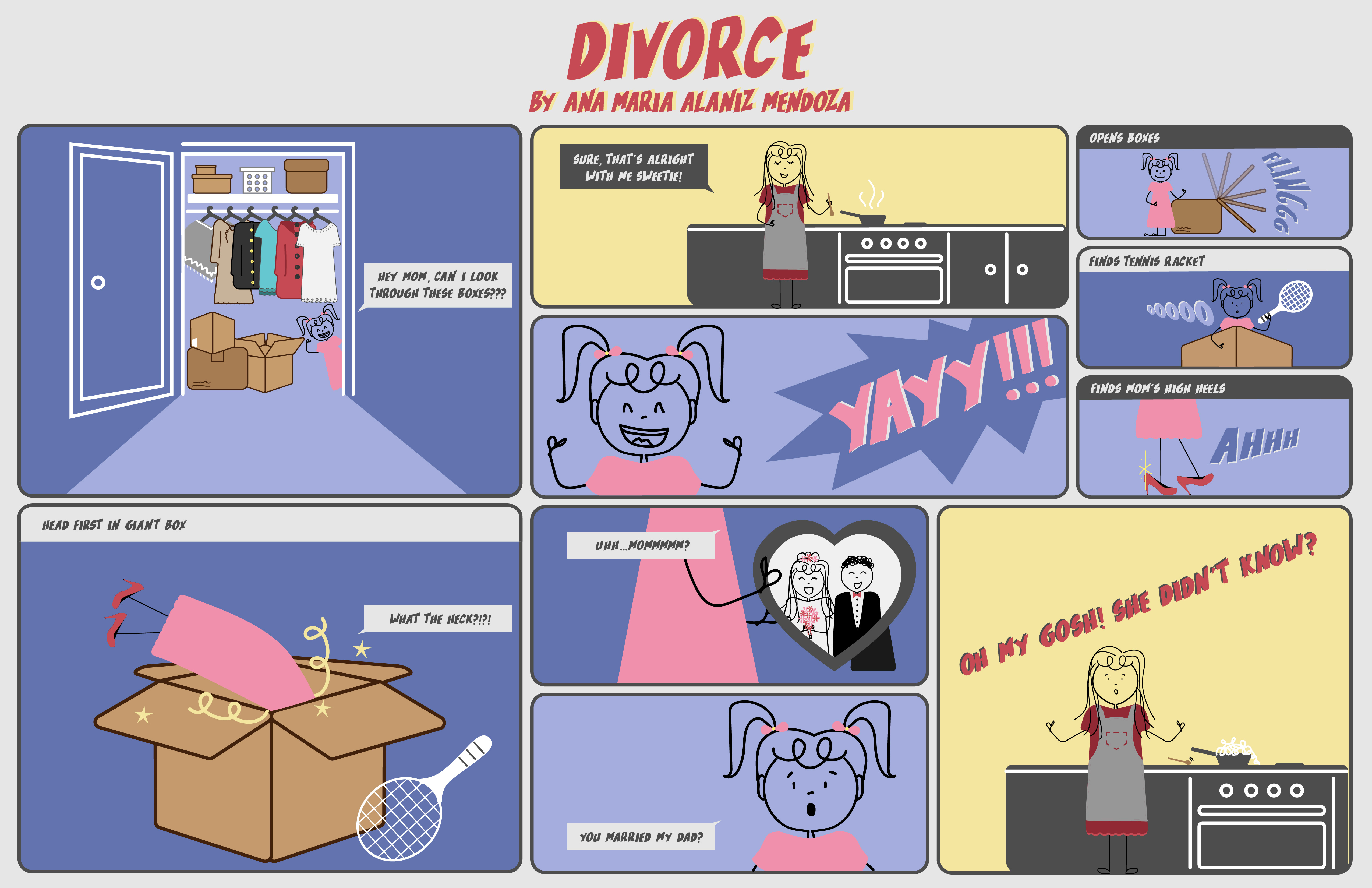 In chapter 5, p.132 of Scott McCloud’s Understanding Comics, he says, “When a story hinges more on characterization than cold plot, there may not be a lot to show externally, but the landscape of the characters’ minds can be quite a sight!” My iconography is very simple and playful, however, the message in my comic is more personal and serious. I did this because I think many people may find this comic relatable in regards to the extreme ways divorce impacts kids without people realizing it.