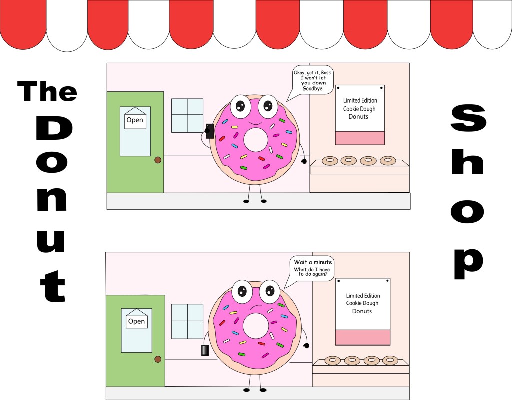My creative plan was to do something lighthearted and simple looking. I decided to make my frames top to bottom and left to right because it would be easier to read and I felt like the simple layout worked well with my design. I put two boxes on top of each other because I wanted the layout to seem like a picture of a building as well as a comic. The type of closure that my comic had was action to action. In McClouds words, it is transitions featuring a single subject. In one moment you see the donut holding the phone, and in the next you see the phone down. Linguistic was a big part of this comic. Even though the title is “The Donut Shop” if you look at the backdrop it can be hard to figure out where the place may be, despite the donuts on the shelf. I put a poster advertising donuts to make sure the audience knew that it was a donut shop. I also added the open and close sign on the door as well, to make sure the location of the backdrop was clear. You can also see that the donut is on the phone with his boss. If there was no linguistic you would not know who he is on the phone with and why his face expression is changed.