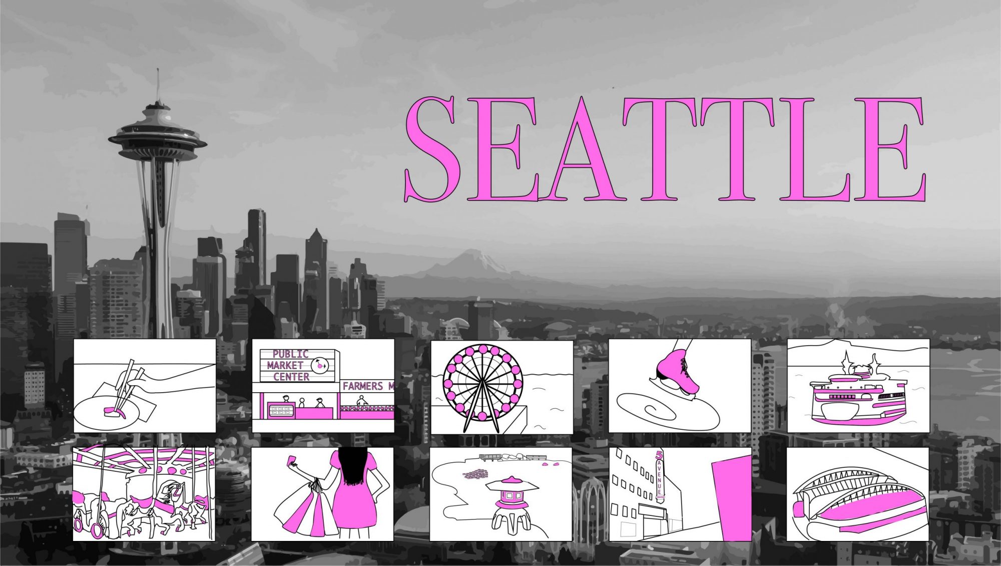 This was not my first time using Illustrator but I think that this project taught me a lot about it. I really enjoyed learning about the image trace capability because I have never used it before but I think that it added a lot to my project and makes it look higher quality. I think the skyline draws viewers through the Space Needle being such a well known icon. I’m glad that I was able to use the image trace for it because I fear my own drawing of the space needle would be harder to recognize. My favorite tool I used was the straight line tool, because it is very versatile snd helped create many of my items.
