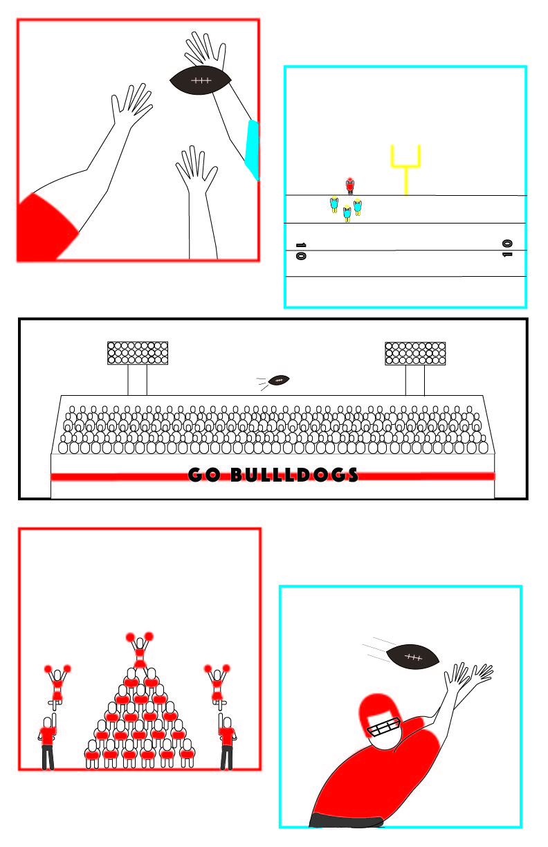 fact is action is the best way that I believe to challenge a readers traditional reading style. That being said I then choose to pick a topic that is very action packed and I came up with “Football.” I choose to offset the the comic frames as too inhibit a person’s natural reading style. I also focused on using the actual football itself as a tool to make the time between frames seem obscure. Three of my five frames include the football traveling. I think the traveling of the football is what guides the viewer through my comic strip. My comic features two styles of closure: Action to Action and Aspect to Aspect. The Action to Action is represented by the football traveling and the players attempting to receive it. You can tell multiple people are in pursuit of the ball. I think it is important that I left it up to the viewer to decide who is on offense and who is on defense because it changes the story either ways. The Aspect to Aspect is represented by the frame of the players, the frame including the crowd, and the frame including the cheerleaders. I believe that my comic strip does a great job of having an obscure timeline. You could look at my comic diagonally and it would still make sense. I think that the football driving the timeline is what sets my comic apart. Additionally, my comic doesn’t feature who threw the ball which makes it possible for the viewer to interpret it in many different ways. I have use the Illustrator software once before in Com 210. That is the extent of my experience with the software. The tutorials taught me alot. Most importantly though it taught me how to organize my work in the illustrator software. The iconography I used varies from somewhat realistic to bubble people. I did this to express that my frames were either up close or far away. I think that viewers will pick up on this because only two of my frames feature somewhat realistic figures. Whereas the other three feature bubble people. I would also say that viewers will interpret my iconography as being very organized and precise. I think my limited experience with adobe illustrator was my only limitation when it came to this project. I found myself using the anchor point tool and the arch tool to create the shapes and figures I wanted. I also used the layers panel extensively alongside the properties panel when it came to my figures, color splotches, and shapes. Creating the figures was quite challenging.