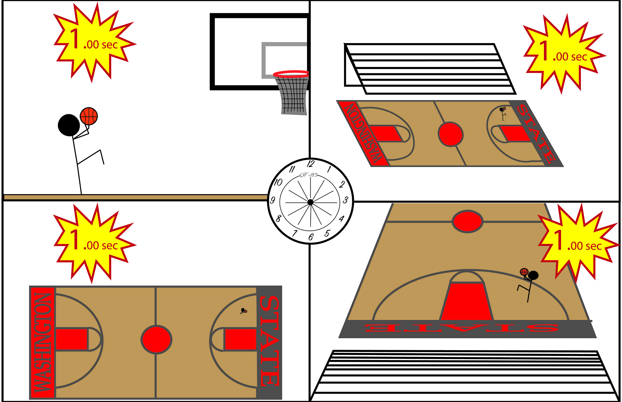 For my comic, I wanted to convey an action scene, but in each frame, I wanted no time to have passed. I wanted to show a moment in time, relayed at 4 different viewpoints that all have different suggestions with it. I chose to include a clock in the center with hands pointed at every hour symbolizing time has stopped or that this scene can be at any hour of any-day, or every hour of everyday, if it continues to be still. Although there are 4 distinct panels, no matter which panel one chooses to focus on, no time will have passed from the panel prior. A typical reader might still read this comic left to right, however, they would realize the lack of time throughout this comic, making it a depiction of one single moment in a scene. I think my comic conveys closure by allowing the reader to view it as a whole, rather than frame-to-frame. Because of the different perspectives, it makes one view it as one whole image, rather than 4 separate ones. I used the linguistic mode to show the amount of time left on the shot clock. I did this to reinforce the fact that no time is passing, for once someone sees the time is the same in every frame, they will be able to decipher the one single moment. I thought this strategy was cool because basketball is such a fast paced and quick game, that not many people are able to stop for one moment and look into the different perspectives. This comic allows one to see viewpoints, including court-side, of something like a game winner with one second left.