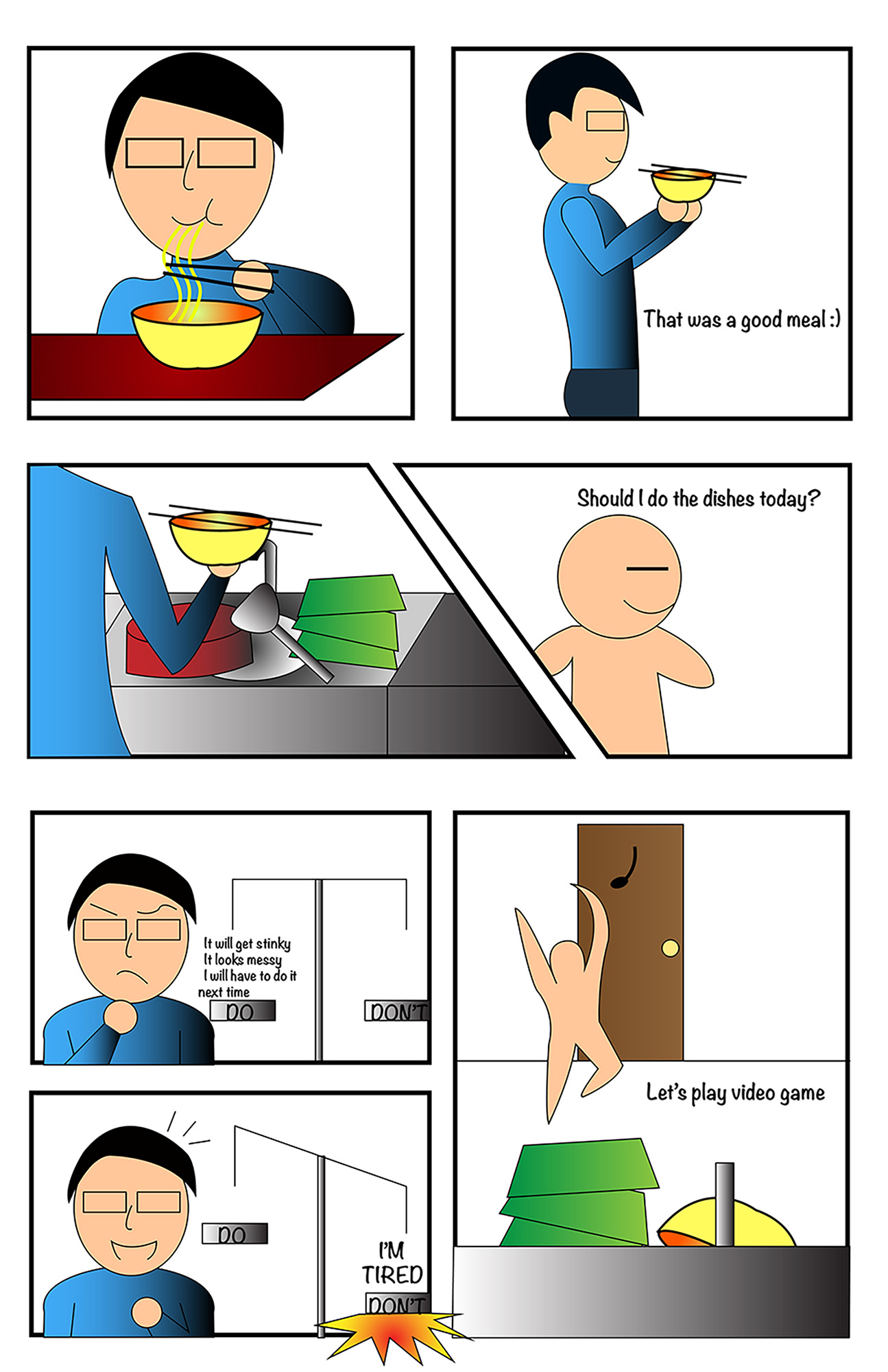 They said an attractive man is one who can make fun of himself, so I took that advice and that is how I come up with the idea for this project. I believe my comic follows the rules of left-to-right, top-to-bottom accurately that the readers can follow it easily. The first to second frame is an action-to-action as the character moved to a different action which is bringing the bowl to the sink after he finish eating. Another example is from frame 6 to 7, an aspect-to-aspect as it change the angle and focus in a different object. From the character to the sink. That is the reason why I minimized the character since he is far away and not the object I want the reader to focus on. The linguistic mode I used in the comic is mostly the character’s dialog, they are mostly addictive as the words are not necessary explain fully the images. But in frame 6 and 7 I believe they are more interdependent since they are the character reasoning and it is required the audience to read in order to understand that part. Overall, my comic describes the passage of time in a logical way. In frame 6 and 7 it may needs a little bit of time for the reader to read but the whole thinking process should takes the character in a flash. The scale is also a representation of a person’s decision which I believed is an understandable and inventive strategy.