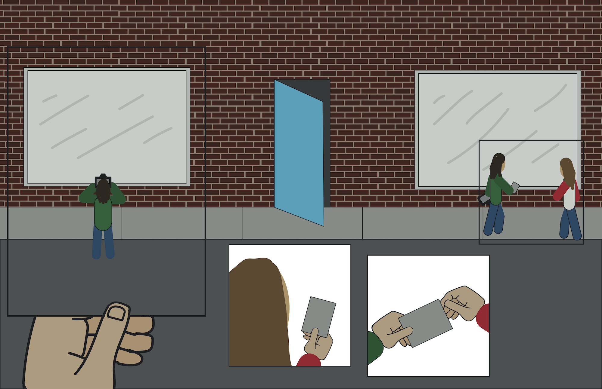 For my poster comic I show a scene taking place in front of a building. The timeline of the comic moves in a circle, so you could look anywhere in the comic and you’ll be able to follow along. The general storyline though is of a person taking a picture, they then give the picture to another person nearby, and when that person holds the photo up it shows the original person taking the picture. I chose this because I wanted to have frames in the comic that sort of showed two different things happening at the same time. I like the way that I showed passage of time because I feel that its still fairly easy to understand, but isn’t the same order that we read most things in. There are four frames in the comic besides the background. The type of closure that I used was action to action for the most part, the whole scene sort of overlaps but the frames themselves are in an action to action sequence, where each thing happens right after the other in a loop. I didn’t use any text or dialogue in the comic because I didn’t feel like it was needed. I was originally going to put the word cafe above the door of the building though. This was my first time using illustrator and I found it fairly difficult. Im very used to photoshop so it was confusing to use a program that looked so visually similar, and had many of the same tools, but was completely different. There were a couple of small things that I missed too when using illustrator, but realized that I had messed up on one I printed. For example a couple of the frames have different sized outlines, and on the lower middle Frame the persons hair is two slightly different colors (I’m still not sure how that happened). There were also a lot of things that I am normally able to do in photoshop but wasn’t able to do in illustrator, and the tools were a bit more confusing for me in comparison. For example I wanted to be able to merge shapes onto a single layer but I wasn’t able to easily do that. Some of these limitations made it difficult for me to make the comic look the way that I wanted to, and that affected the methods I used and the overall look of the final version. I would have liked to have better looking people in the comic, but a lot of the tools were difficult for me so I ended up using fairly basic shapes to make things. I think the most useful tool for me was the live paint tool. This allowed me to draw shapes and then fill them in with a solid color. The shapes were fairly limited so this gave me the ability to make the hands and the peoples hair. I found this project to be more difficult than the photoshop collage because of my lack of experience, but I still had fun and learned the basics if illustrator.