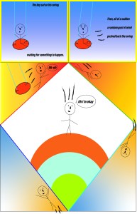 The way that I show closure in my comic is in the way that I combine words and images in my last frame in the middle of the comic. My character tells the reader that he is ok after falling out of the swing and is firmly planted on the ground. I use words in the beginning as a narrating voice and as well as my character using his own words in the comic. These linguistic modes of information help the reader to understand why my character fell out of his swing, as well as to give a sense of closure to the comic at the end. My comic shows the passage of time in the sense of the entire comic showing an action sequence and the character reacting to it as a normal person would. The use of my frames shows the passing of time because of how my character is moving in a natural and flowing way.