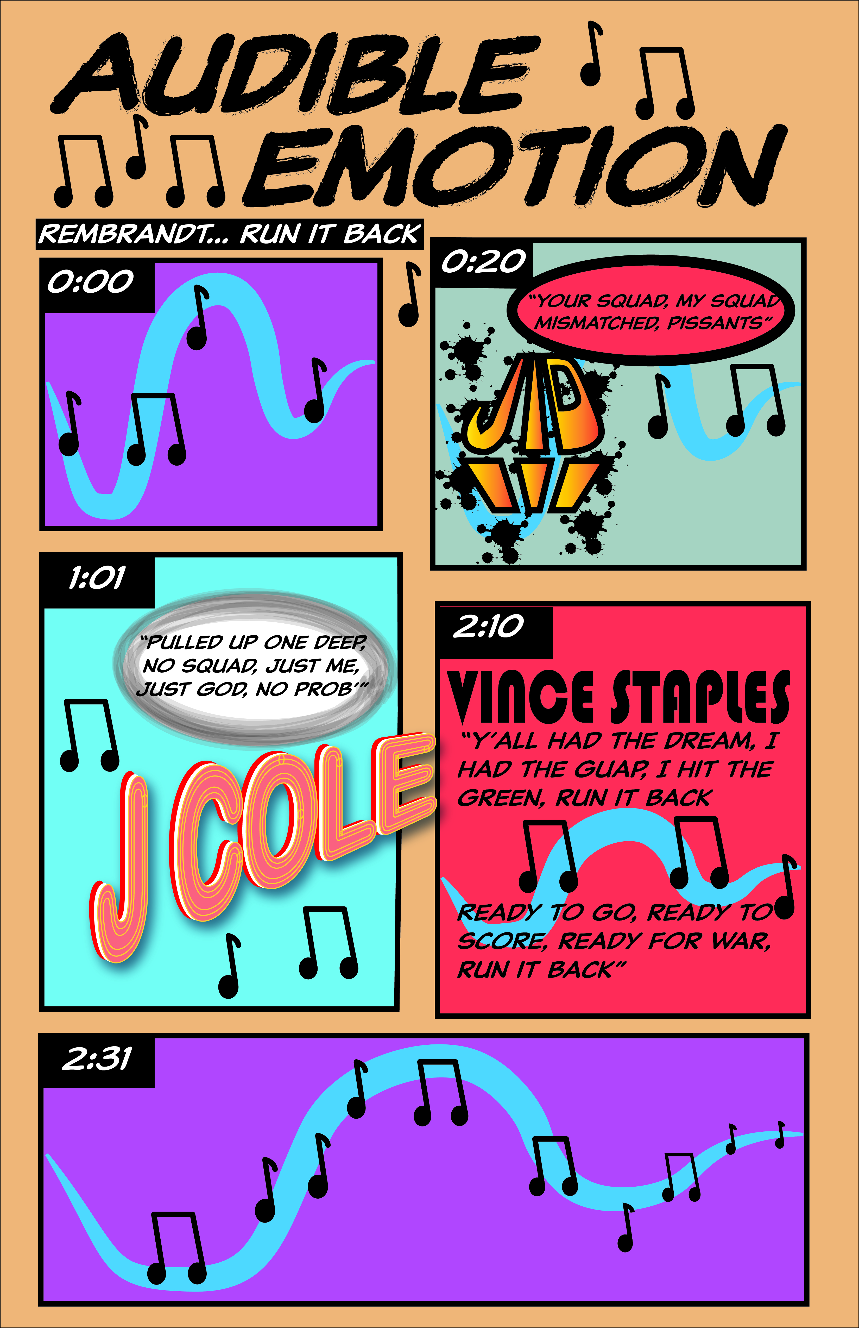 Creating this project was only the second time I had used Illustrator. Although I feel like I learned most of the features with my first time using it, I felt very comfortable with it and was mostly reminded of things, rather than learning new things. Because this comic is word-heavy, I wanted to really pay attention to the fonts I used. Each font indicates something else. I have my basic font, which is shown in the body text, title and subtitle. Another way that I use lettering is to indicate which artist is currently on the song, so I made a different textual design for each of the artists (J.I.D, J Cole, and Vince Staples). I did feel limited in Illustrator because I had to make all iconography myself and I am not yet very experienced in the program. I think the most useful tutorials were all of the pen tutorials as it allowed me to make a cool logo for J.I.D.