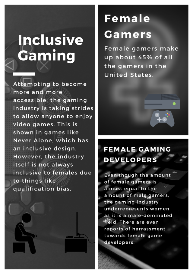 For Digital Reflection 2, I wanted to make a more informational poster, which provides insight to the gaming industry. I created this poster about Inclusive Gaming using the Canva app. My poster attempts to connect the three course concepts of inclusive game design, diversity in gaming, and qualification bias. The video game Never Alone inspired me because I wanted to represent one of the accessible features of the game in this poster. Like the game, this poster had a grayscale color pallet, which means that color blind people will have the same experience with the poster (or game) as someone without color blindness. Similarly, Never Alone has fairly basic graphics and a grayscale color pallet in an attempt to make the game accessible to more types of people. Another aspect of gaming that I wanted to explore in this project is diversity in gaming, both in the consumers and producers of games. What I found was that females make up more of the demographic of gamers than I previously thought. I assumed that at most about a third of gamers are female, but it turns out that 45% of gamers in the United States are females. This is surprising to me because the underrepresentation/misrepresentation of women in video games made me think that females would be less interested in the medium. However, where the issue of women being underrepresented/misrepresented in video games comes from is that there are not enough female video game developers. This is also where the last course concept comes in, which is qualification bias. Video game development has been a historically male-dominated field and it has been very hard for women to breakthrough in this industry. Unfortunately, female game developers have reported issues of harassment in the workplace simply because they are female. Weirdly, gaming is both very diverse and not diverse enough at the same time. There are enough female gamers for positive depictions of women in a video game to be successful. However, there might not be enough female game developers to create an accurate, positive representation of women in video games, so they are still misrepresented, with oversexualization as an example.