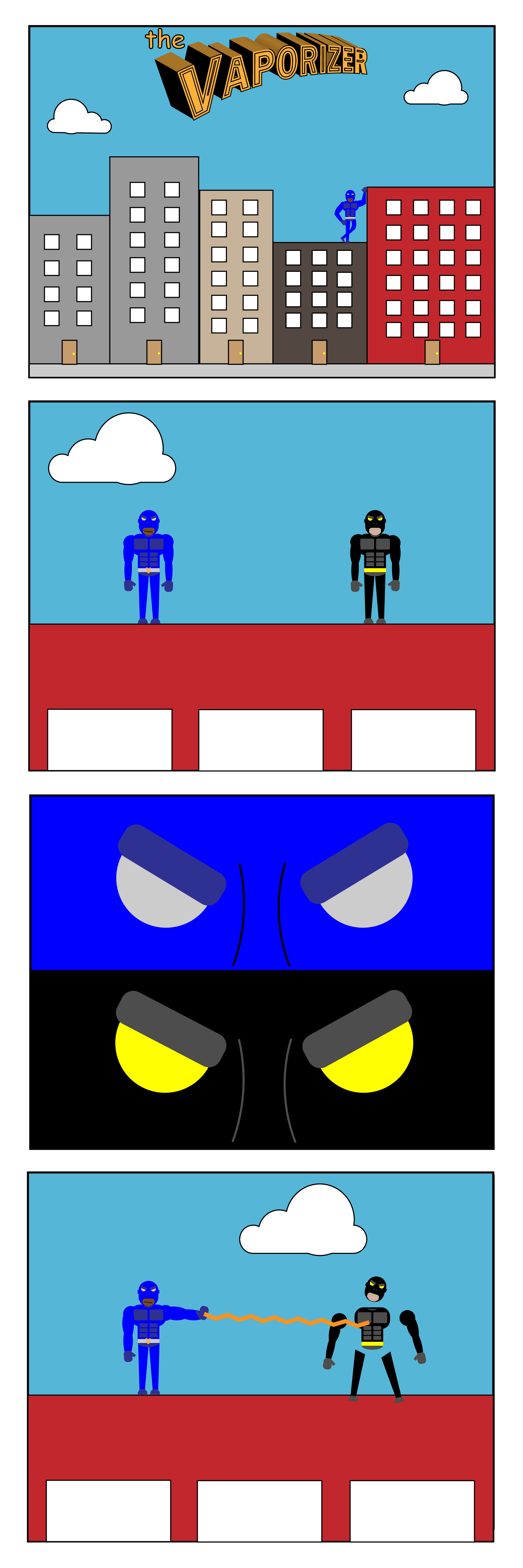 While working on the final web comic, I learned a lot of new techniques in Illustrator that helped me create some of the designs I was struggling with. One technique I learned was creating text that resembled the Superman font style. I learned this technique from a video on YouTube. In order to create this text I made the text outlines, used the direct selection tool, the shear tool, and the 3D & Bevel panel. Another technique I learned while creating my web comic was how to create superhero characters out of shapes. I also learned this technique from a YouTube video. The Vaporizer, the character in my comic, is made up entirely out of shapes. I mostly used the rounded rectangle and ellipses tool to create the Vaporizer. Once I was done creating him, I copied him and reflected him over the y-axis, then I changed his super suits colors in order to create the villain in my final web comic.