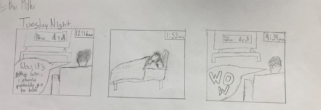 I preferred making the print comic to the digital comic, but there was certainly positives and negatives to both. I’m not a gifted artist, so it took me a while to produce anything recognizable in the print comic, which was definitely frustrating. With the digital comic, everything could be perfect squares or rectangles, so my simple drawing took 100% less ruler work on MS paint than it did physically. There were also drawbacks from the tools I had themselves, such as not having any sort of color for my physical comic or making my digital comic on paint, where I couldn’t adjust shapes, rotate text, etc… The process was much simpler on the digital comic though, it felt more comfortable to size things perfectly, undo a mistake without having to worry about erasing and having streak marks.