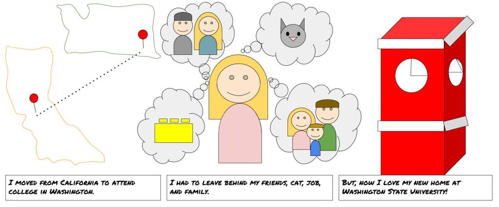 I created nearly identical comics in two forms. One that was hand-drawn and one that was done digitally. For my comics, I decided to tell the story of my move to Washington State from my home in California. After presenting my comic to the class on Friday of last week, I became aware of the fact that I was not very descriptive to where I was moving to. I was relying on my peer’s knowledge, and outside of my class, this would not make sense. The difference between my hand-drawn comic and my digital one is that I added what I was doing/where I was going. The difference between these two is that with the digital one I was able to quickly make changes and adapt my new text to my story. With the paper one, I would have had to erase and rework my comic which would not have been so easy. I think this was one benefit of making my comic digital. However, I liked that with hand-drawing it gave my comic more of a personal feel as I was writing a personal narrative with my own illustrations.