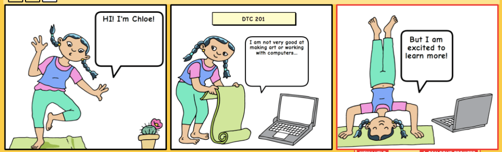 For both comic strips I used mostly linguistic and visual mode. In both of my comics, there is an image of what is supposed to represent me. I am explaining that I am not very artistic, however I am excited to learn more and build my skill base during the class. There are speech bubbles with words that represent the linguistic mode, and images of me, a computer and a plant that are the visual mode.