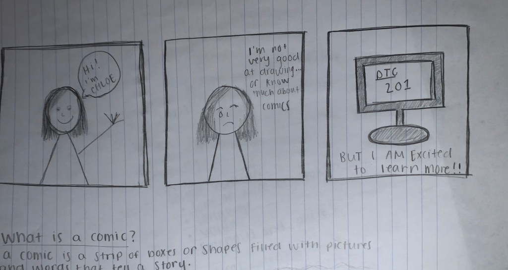 Personally, at this point in time I preferred the hand drawn approach to creating my comic because I feel that it was easier to plan out and more accessible than using a digitized software. Everyone at some point in their life has picked up a paper and pen and drawn, wrote, doodled, colored, scribbled, etc. Even though I am not a great artist, I felt I had more freedom with the paper. However, I feel as though as I learn more about digital softwares I will prefer to create comics in that form. The reason being is that I have never been an advanced artist by hand, and that is something that I have struggled with. If I can learn how to create art digitally where I am not relying on the steadiness of my hand, or ability to create a recognizable image, I would succeed and enjoy the work far more. Attached are each of my comics. You will notice that neither comic is very advanced. I found an online comic generator that used clip art of already created characters that I thought could represent me.
