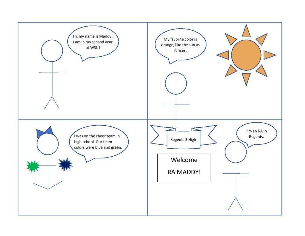 After reading the first chapter of Scott McCloud’s “Understanding Comics,” I adjusted my plan for my digital comic. McCloud’s idea that comics are in a “deliberate sequence” stood out to me. To ensure that my comic was in a deliberate order, I went from past to present. I started by explaining my favorite color, which I have loved for a long time. Then, I added that I did cheer in high school. Finally, I added that I am now an RA in Regents. While this sequence may not be immediately obvious to the reader, I think that it helps with the complexity of the comic.