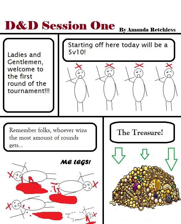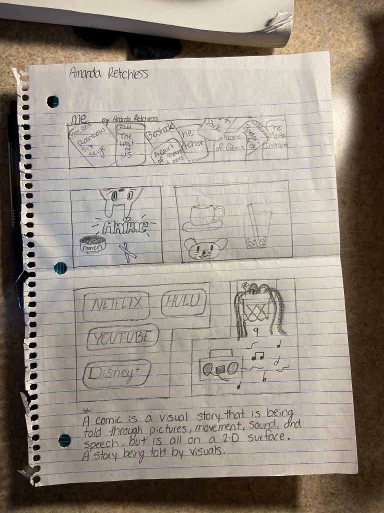 The first comic I made for this class was the hand drawn comic. I think that I was able to made the hand drawn comic more detailed and it meant more to me compared to when I made the online comic. First of all, for the hand drawn comic all I used was a pencil and paper. It was super easy to use and I was able to do whatever I wanted, whatever my drawing skills would allow me to do. For the webcomic I used Microsoft Paint. I used this because I have never made art online and I had no idea what I was doing. Going into both of these comics I had no artistic skill and I didn’t know what I was doing. In the end I think that the hand drawn comic is better visually, but I think that my webcomic is better for a story that I wanted to be told. Some benefits when I made the hand comic was that I was able to do whatever I wanted, there was no restrictions to what I could and couldn’t do. One of the drawbacks when I was making my hand drawn comic was that I wasn’t able to duplicate frames. For example, if I had to draw the same thing for multiple frames, I would have to redraw every one of them and they wouldn’t look the same. A benefit for when I made the webcomic was that it was easy to use and I had a variety of tools that I otherwise wouldn’t have. A con to the webcomic was that because I was new at making an online comic, it was really hard to figure out how to use all the tools and I wasn’t able to get what I wanted onto the screen. It felt more precise and artificial than if I just drew it on paper. A difference between reading a comic on paper versus online is that the online comic lacks a bit more detail than a paper comic. The online comic I wasn’t really able to see all the smaller details and the paper one I was able to see all the different marks and the smaller techniques that were using in order to get the comic to look the way it does. When I read the first chapter of Scott McCloud’s “Understanding Comics”, it did give me a few ideas. My first comic didn’t tell a story and it was more of a collage of what I like and liked to do. I read the chapter and afterwards I really liked how he could tell a story within a few pictures. It wouldn’t matter how precise and how detailed the comic was, as long as it made sense it was fine. So, for my second comic I told the story of how my first Dungeons and Dragons session went. It wasn’t pretty, but it told a story.