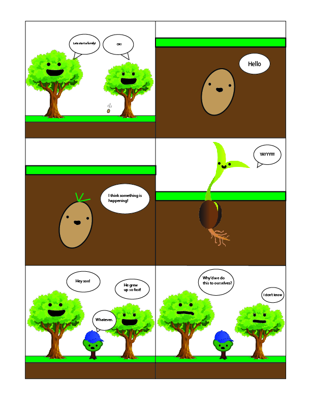 The second comic I created was the digital comic through Adobe Illustrator. In this comic I just made the first thing to pop in my head which ended up being a comic about trees having a baby tree and regretting it. The comic that I made is very simple yet visually appealing. I think that the simplicity of the comic helps it look better. Sometimes less is more. When I was making this comic it definitely took longer than the hand drawn comic because I had to re-learn how to use adobe illustrator. In this case the hand drawn comic was easier but I think in the end the digital comic turned out nicer and better looking. In all both ways of making a comic are effective in their own ways and it just depends on which kind of look you are going for. You can make a hand drawn comic look better than a digital one if you really try and vice versa. Both ways of a comic can work for your idea as long as you are able to share your message.