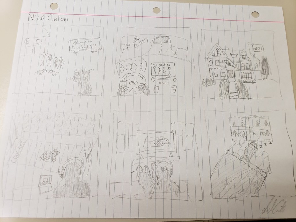 I created two comics, one hand drawn, and the other using Adobe Illustrator. The first comic I made is the hand drawn comic. In the hand drawn comic I made it about myself and some of the things that go on in my life. I started in my home town of Kirkland, Washington and went from there. I mainly just used some of the things I do during my time at WSU like, living in a fraternity, working for Athletic Marketing, and watching the Seahawks. There was a big difference when creating the comics. When I was making the hand drawn comic I just used paper and pencil. This makes it easier to drawn what you are thinking, but it doesn’t look as good as a digital comic. The benefits for creating a hand drawn comic are that you can use your drawing skills to create the image you want for your comic, and you can easily make changes to your work. The drawbacks to creating a comic by hand are that if you don’t try your hardest it wont look as good as a digital comic, also you can’t be as precise when making lines and colors.