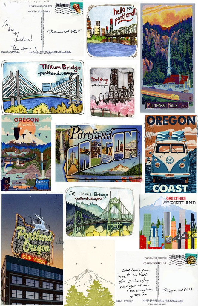 My creative process was challenged through out this project. Collage has never been my favorite element of art only because I absolutely hate finding materials to create something. On top of that, I am minimalist when it comes to what I bring to college. This means I had a very limited collection of items that I could even digitize in the first place. Luckily, that’s what roommates are for. After asking around I explained the concept behind what I was thinking for the project. I wanted to culminate items that felt like home. I believe this concept of home can come in many different forms. I had to ask myself, what do I define as home? This could be the small town I grew up in, the city of Portland which I live near, or even the Pacific Northwest in general. When I asked my roommate, who is also from the Portland, Oregon area, if she had any items from home that may fit my concept she naturally supplied me with everything I needed. On her wall she had around 11 postcards that all relate to Portland, Oregon in some way. Her mom has been sending these cards to her while she is here at college. I thought this was perfect because nothing says home like a message from a mother who misses their child. To further illustrate this narrative I wanted, I decided to scan two of the messages that my roommates mom sent her. I chose messages that were short, simple and could have shared meaning by all. Other messages that had more personal messages were left out.