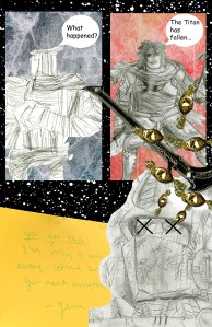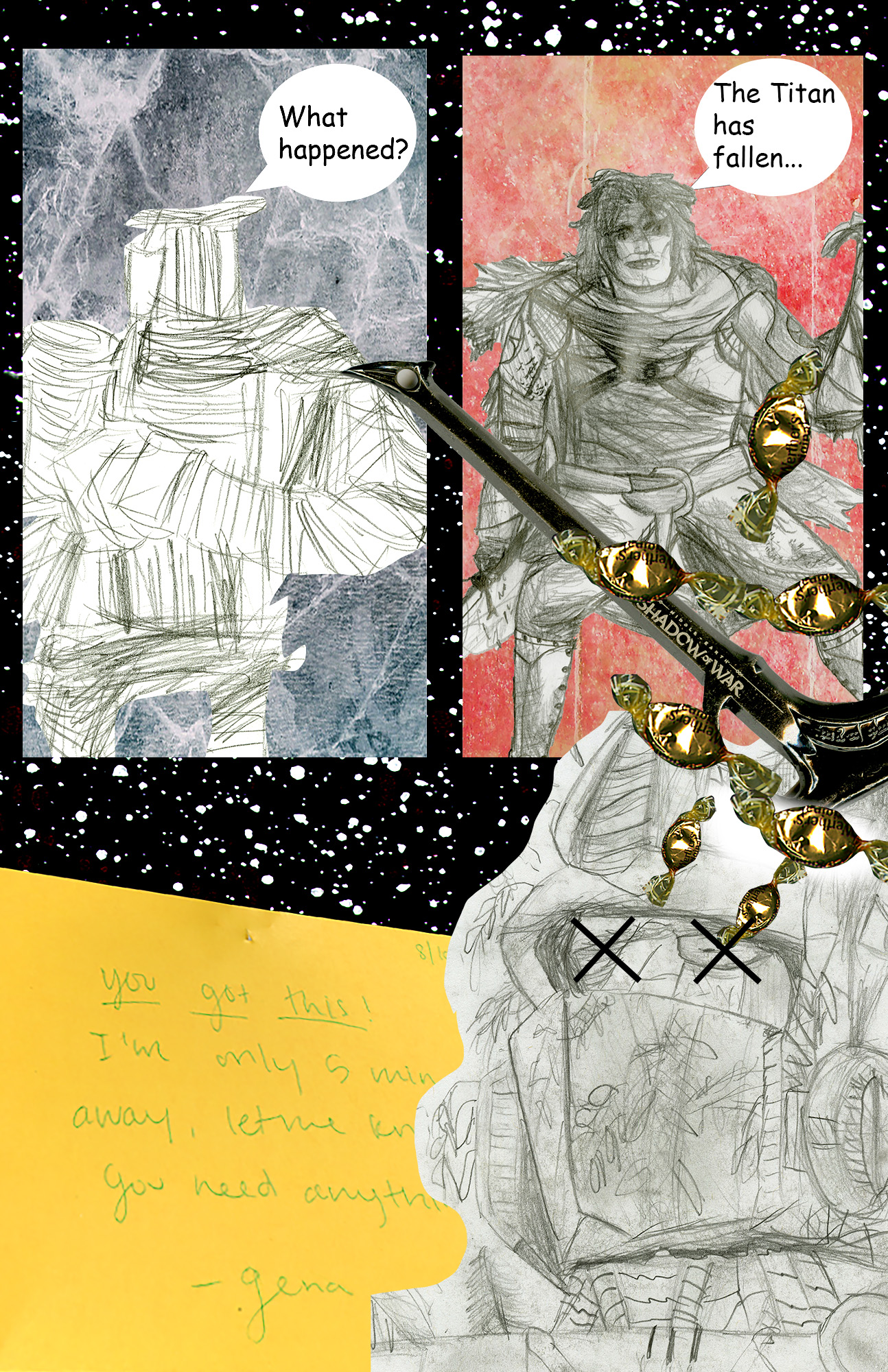 I wanted to juxtapose the images of my sketches with designs that contain color. The sketches are people or characters, while the colored layers are backgrounds, places, and objects. The sketches were done with pencil and and black and white with a photoshop effect on their saturation to make the darks pop out more. The discussion of panels came to mind when making the collage. I am not the biggest fan of collages since I think they are unfocused, unsatisfying to look at, and a bit messy. I didn’t want to put any more layers on this collage then I needed to so that the image would be pleasant to look at and simple. Most of the colors in the image are muted but still serve a purpose to give the black and white sketches a background and hopefully make them easier to see. The panel backgrounds were textures that serve to give a different scene or location to the two sketch characters opposed to the sketch out in front. the sketch out front is imposed on the space stars background as well as on the panels to make it look like the two are focused on him as the subject. The language in the collage is simple. The tow sketch panel characters have an exchange about the defeat of the “Titan”. This is meant to imply a victorious battle that ends with the somber end of the Titan. The only other words are the note from my sister Gena. I put this in the collage to compliment the image and also appear as maybe a good luck note to the characters regarding their battle with the titan.