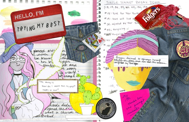 In deciding what to use, I ended up scanning a lot of different pieces of writing and a lot of doodles or other pieces of art I’ve worked on. I kept putting in images and then messing with them in different ways until I could decide if they fit in well or not. Because the whole idea started off with my “Hello I’m trying my best” patch, I made it big and overlapping everything. I really wanted to use vibrant colors and I hadn’t quite planned on a strong use of yellow or reds, it